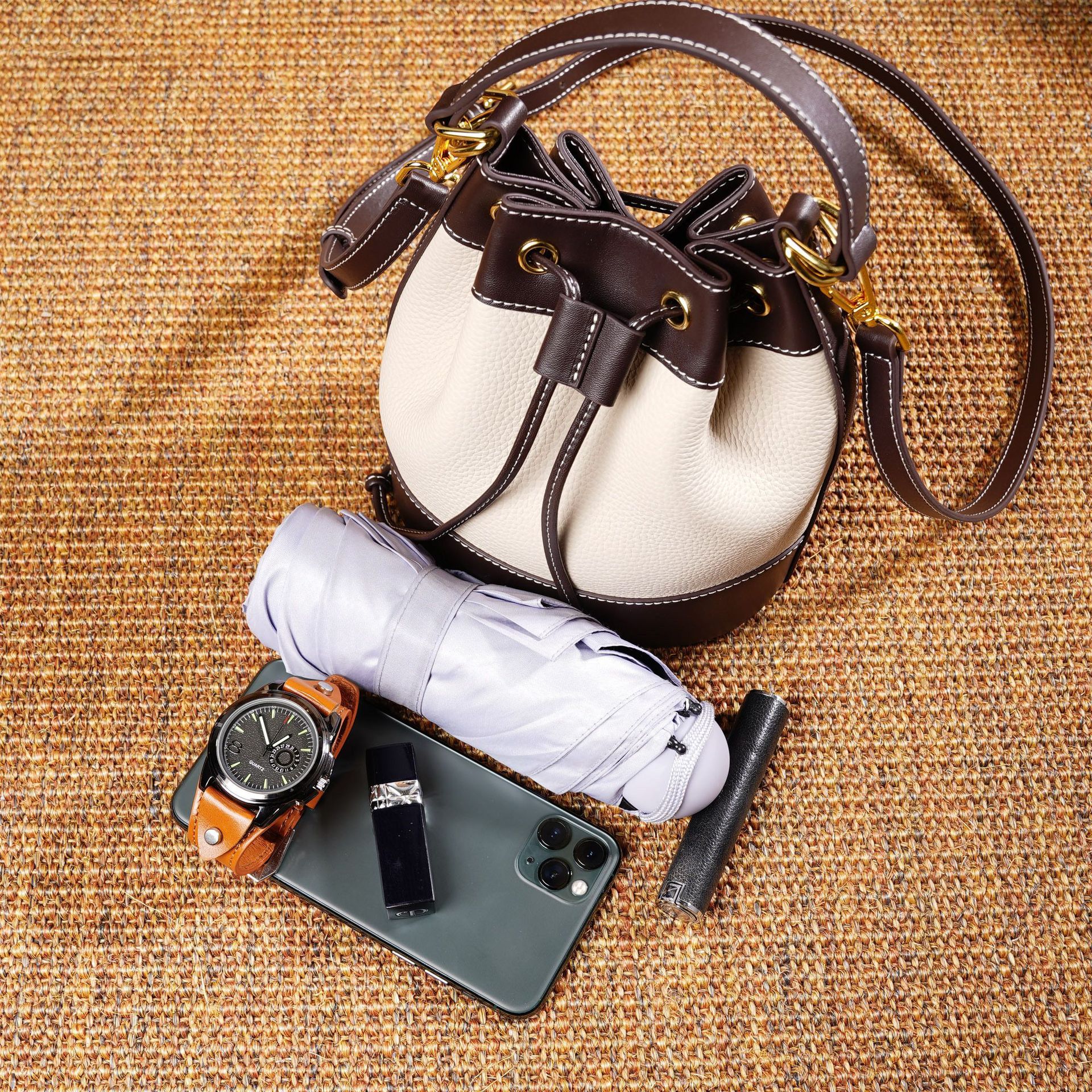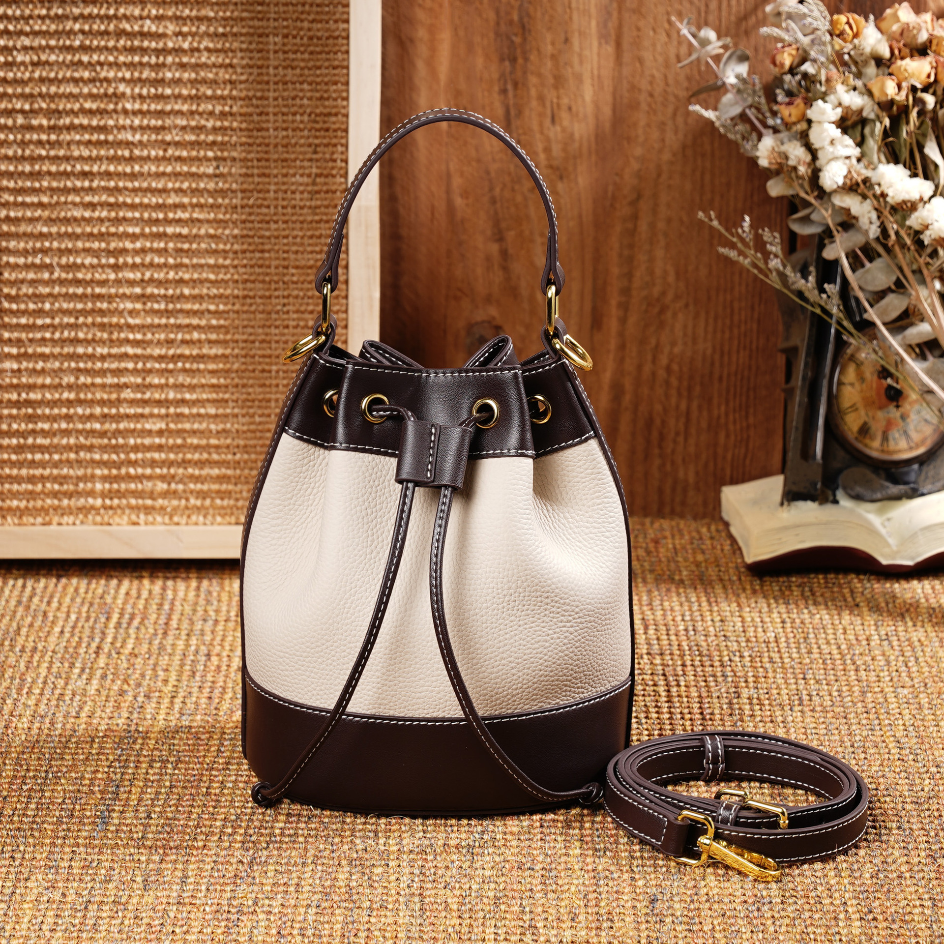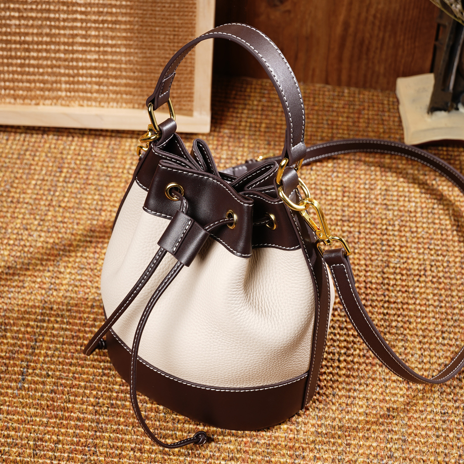 봄과 여름 새로운 2025 탑 레이어 Cowhide 패션 캐주얼 올 매치 빈티지 숄더 백 크로스 백 핸드백 핸드백 버킷 백