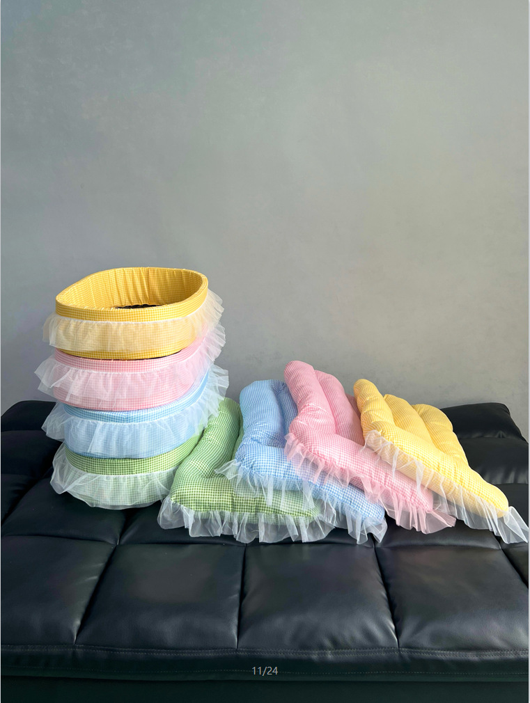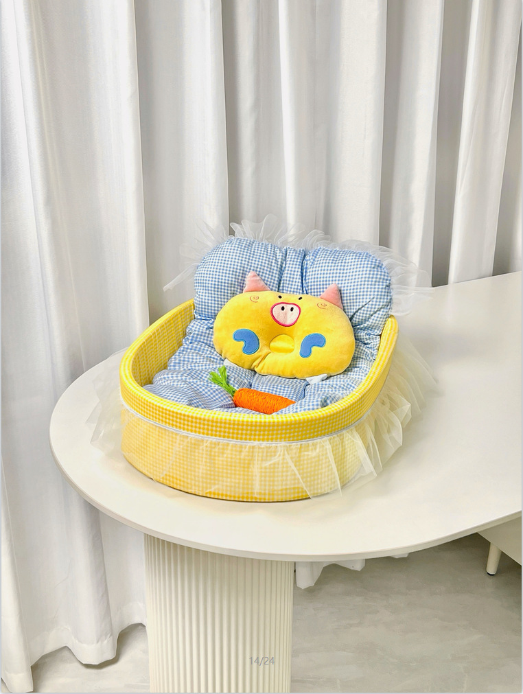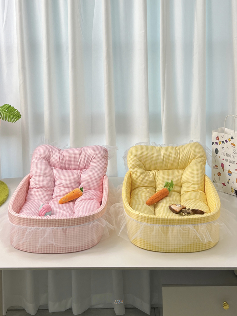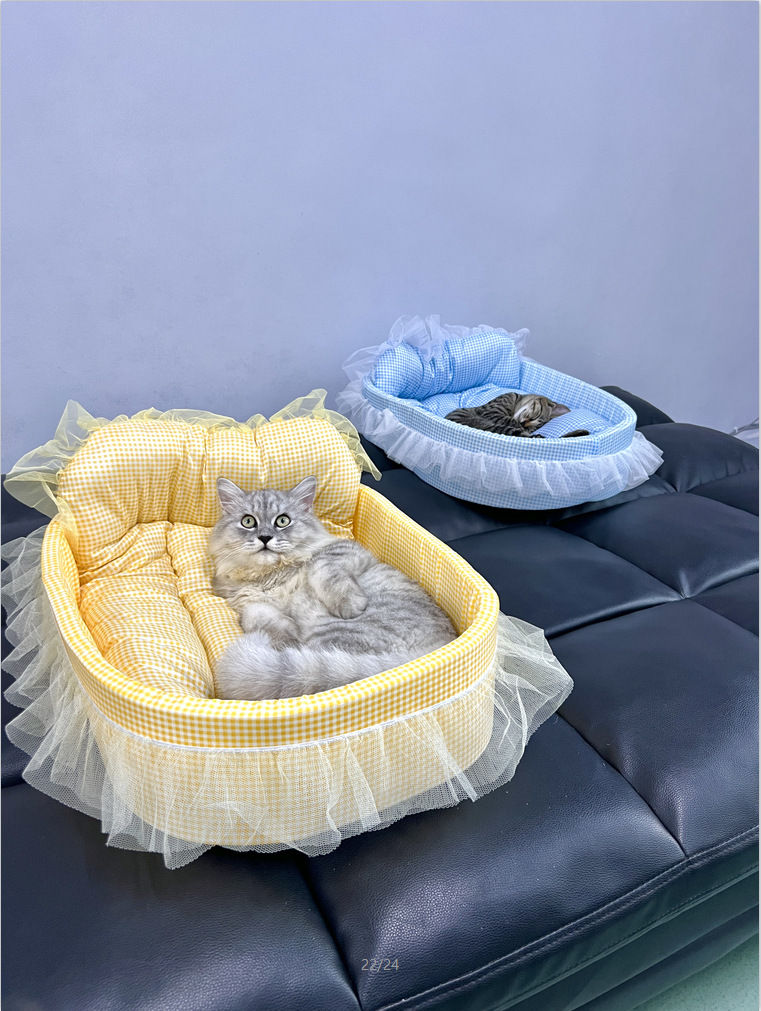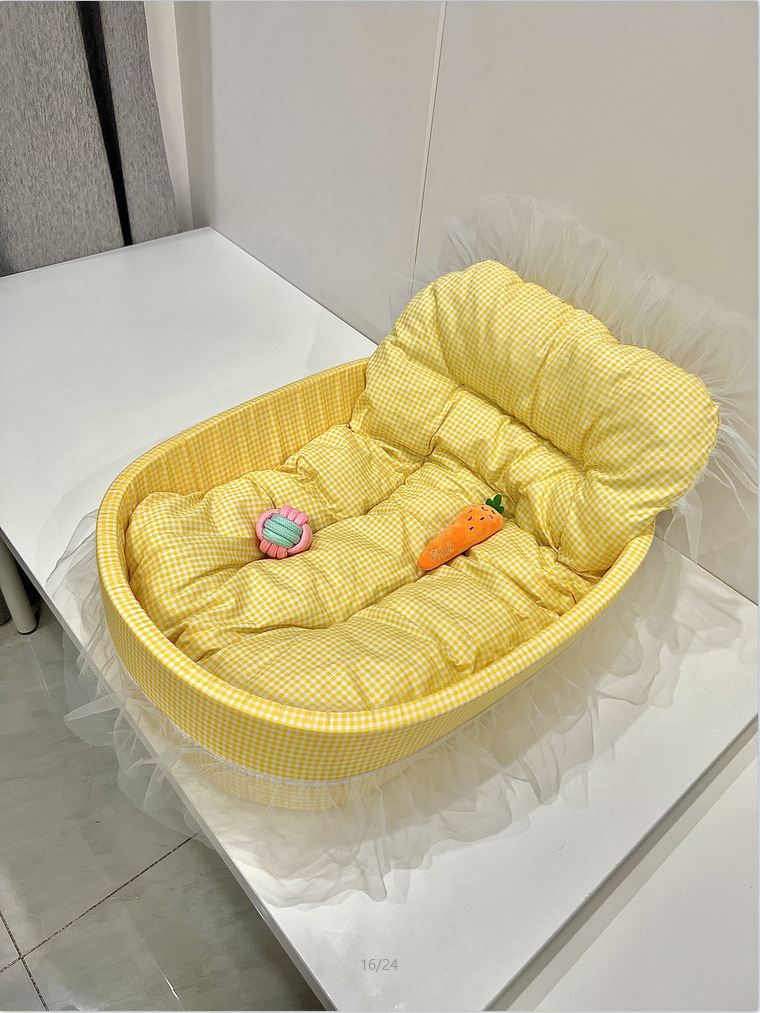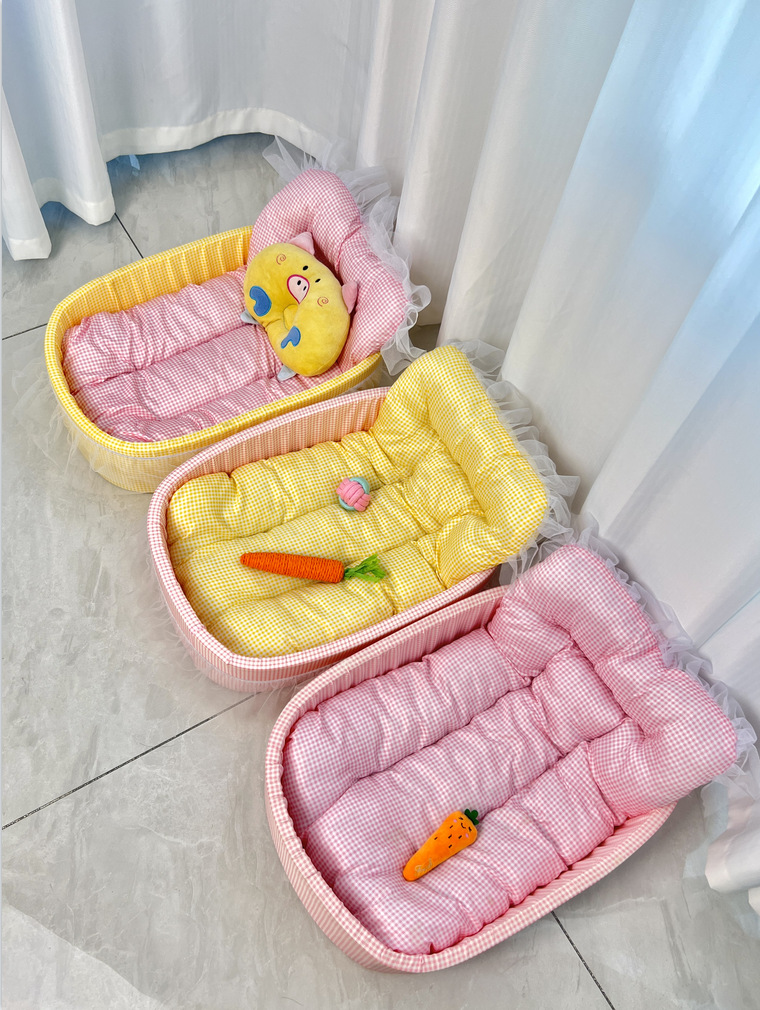 • 노란색 체크무늬 애완동물 둥지 [둥지 바닥 + 매트 + 레이스 포함]