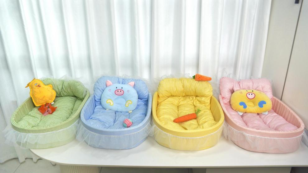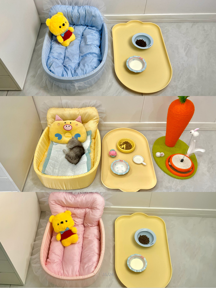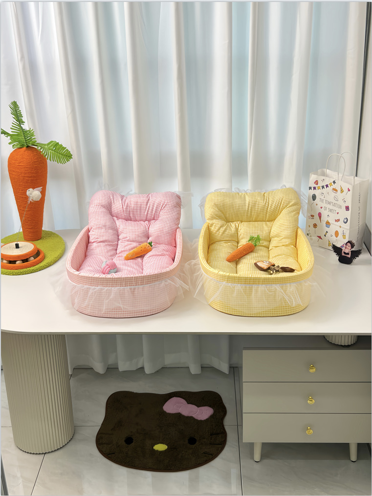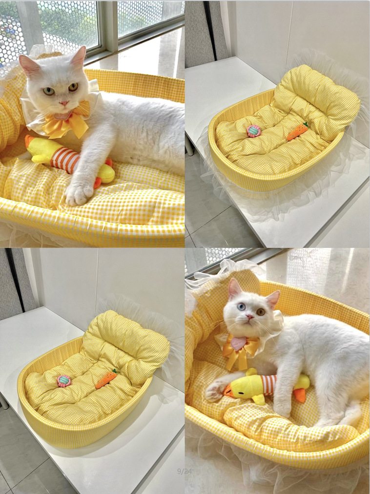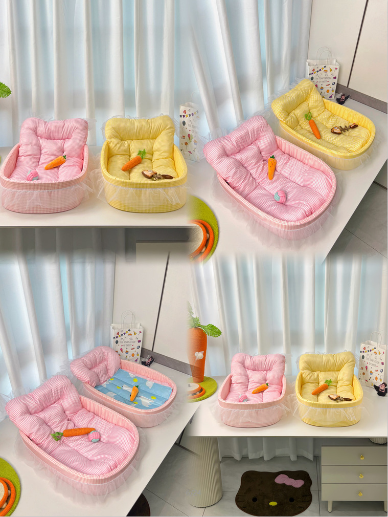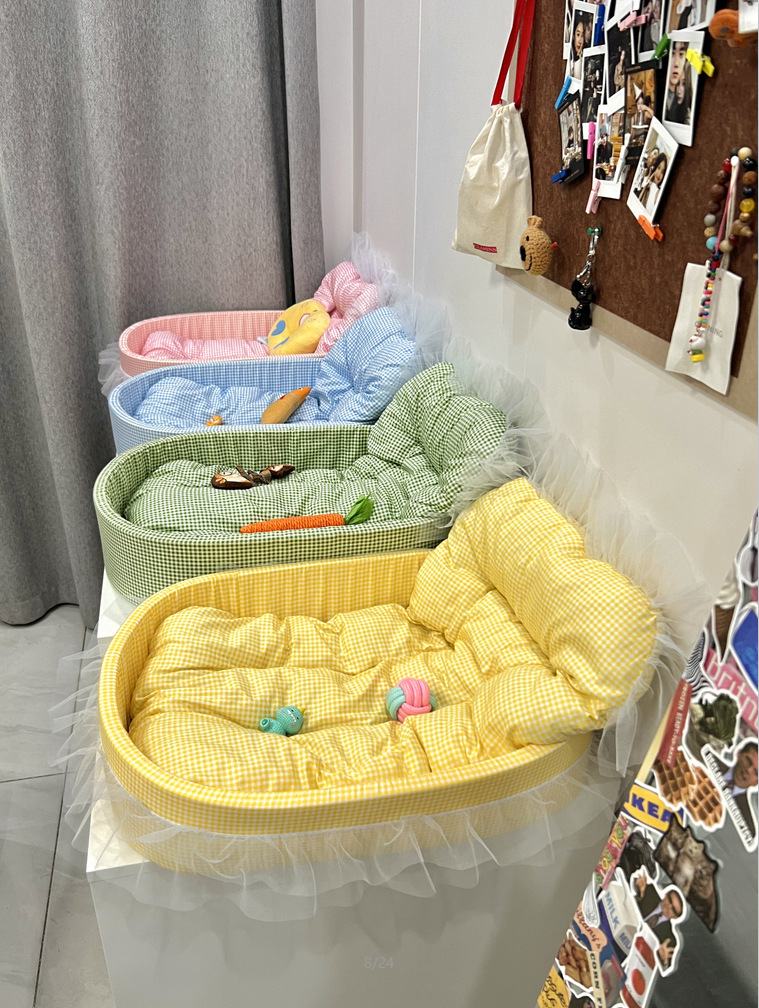 • 노란색 체크무늬 애완동물 둥지 [둥지 바닥 + 매트 + 레이스 포함]