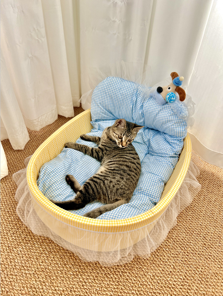 • 파란색 체크무늬 애완동물 둥지 [둥지 바닥 + 매트 + 레이스 포함]