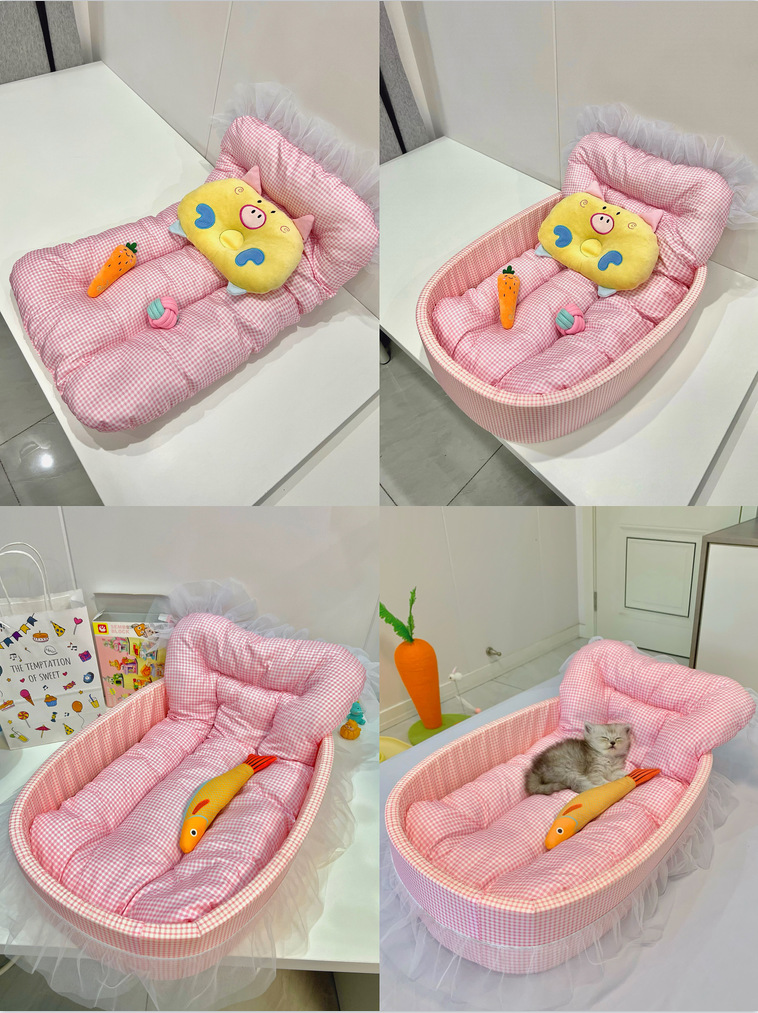 • 핑크 체크무늬 애완동물 둥지 [둥지 바닥 + 매트 + 레이스 포함]