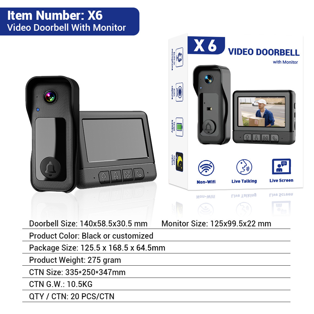• X6 비디오 초인종 블랙(스마트 비디오 초인종 + 4.3inch 실내 화면 + HD 나이트 비전 + 자동 캡처)
