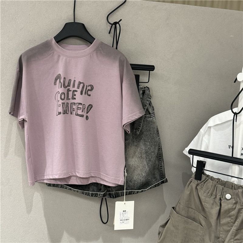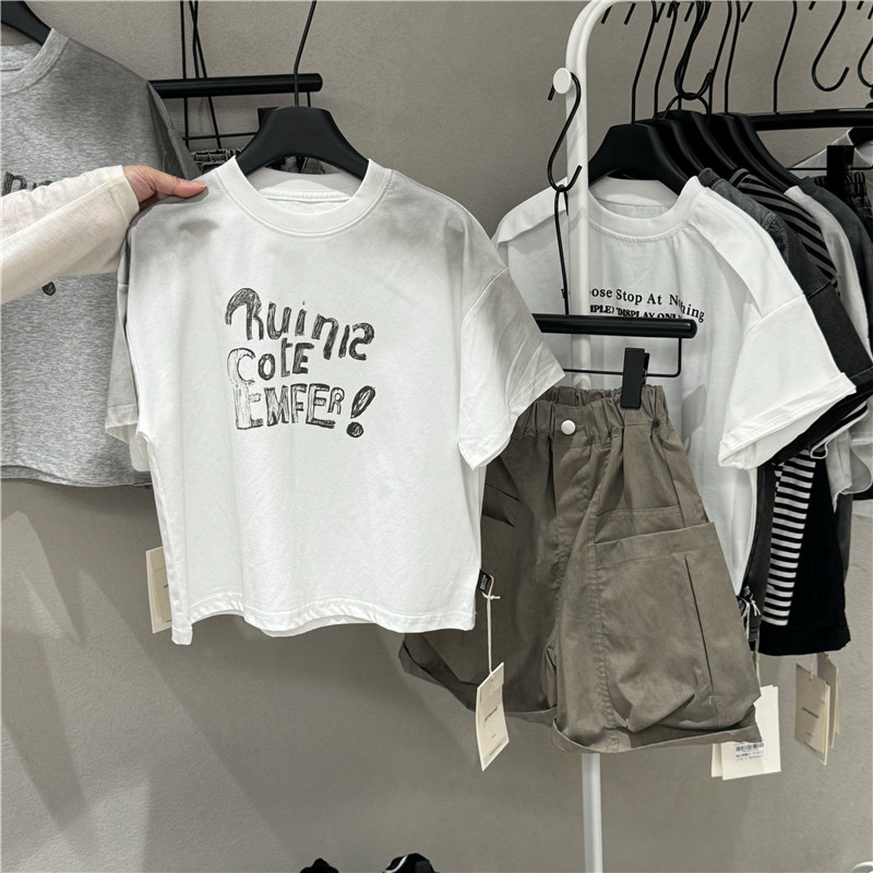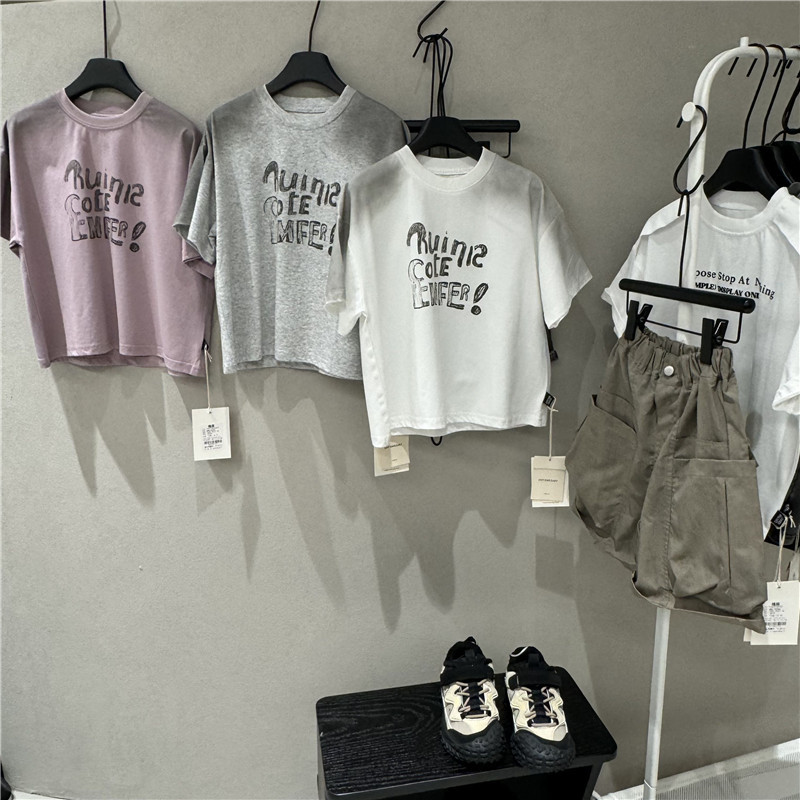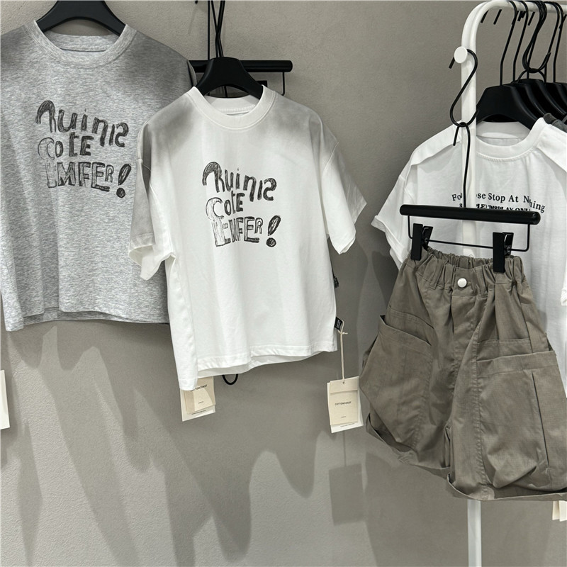 25 여름 새 소년 소녀 크루 넥 짧은 T 어린이 한국 스타일 외국식 편지 인쇄 스프레이 페인트 티셔츠 짧은 소매 최고 트렌디스토어 가기
