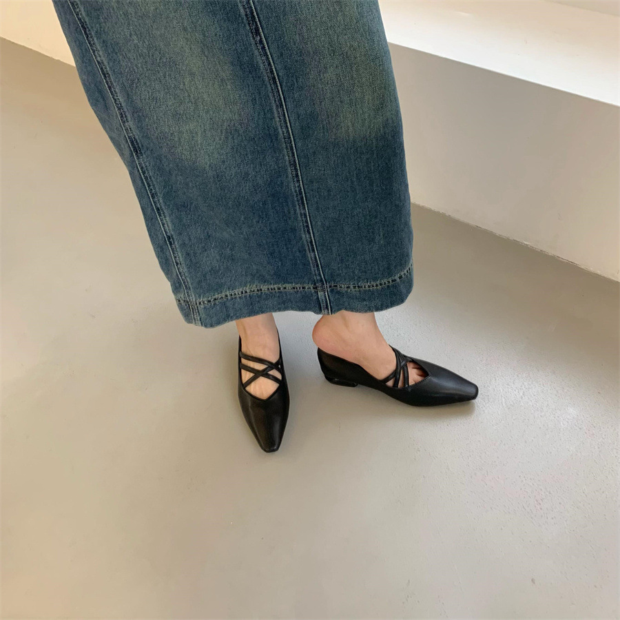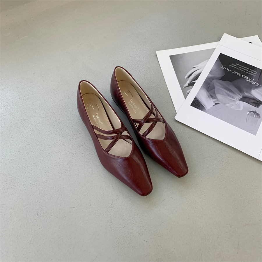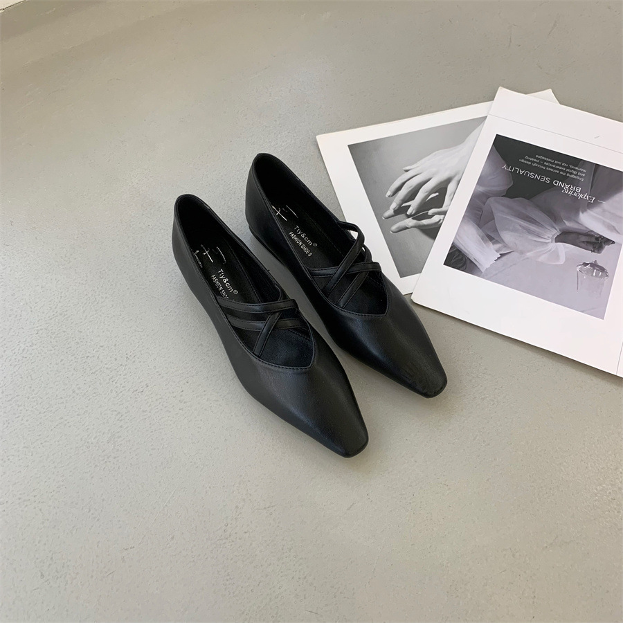 2025 년 여름 뉴 크로스 씬 밴드 포인팅 두꺼운 힐 중간 힐링 싱글 슈즈 웨지 힐 두꺼운 하단 로우 힐 여성 신발