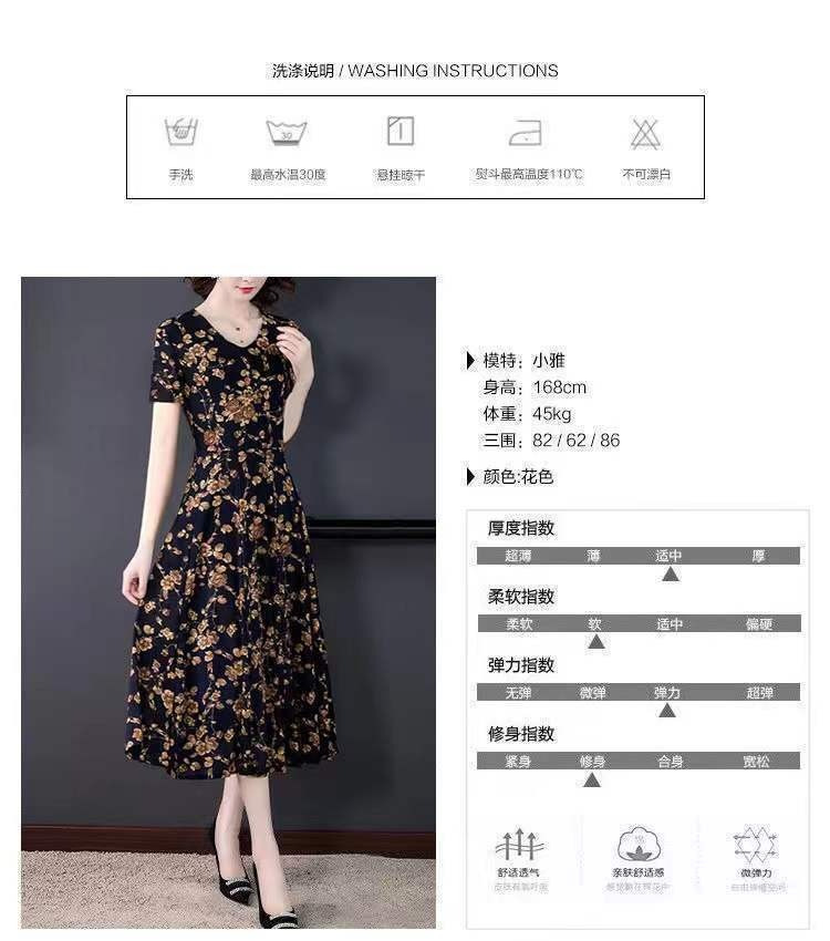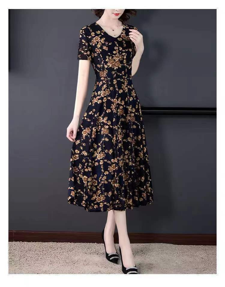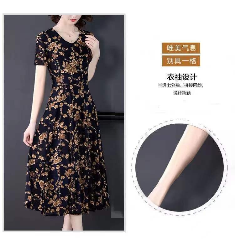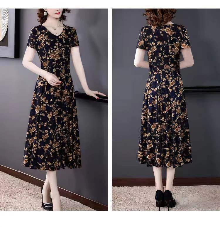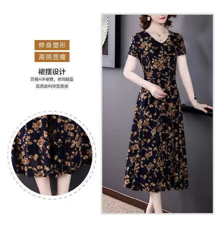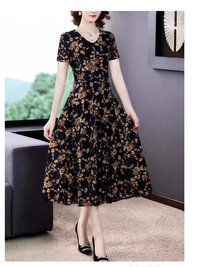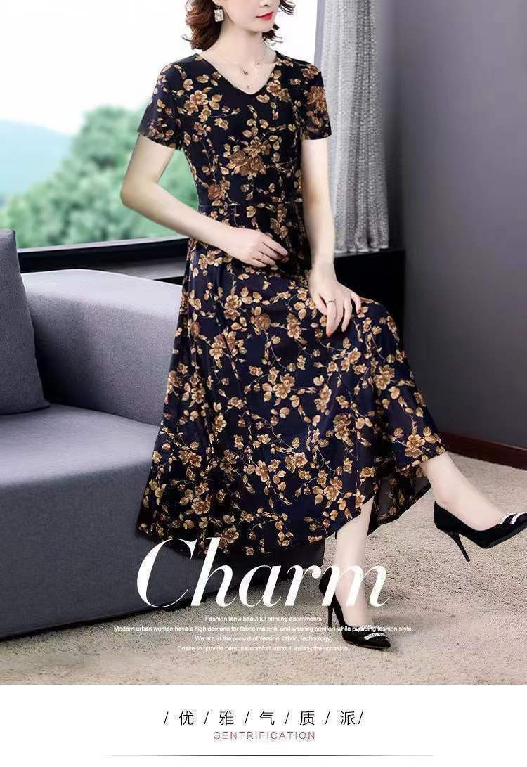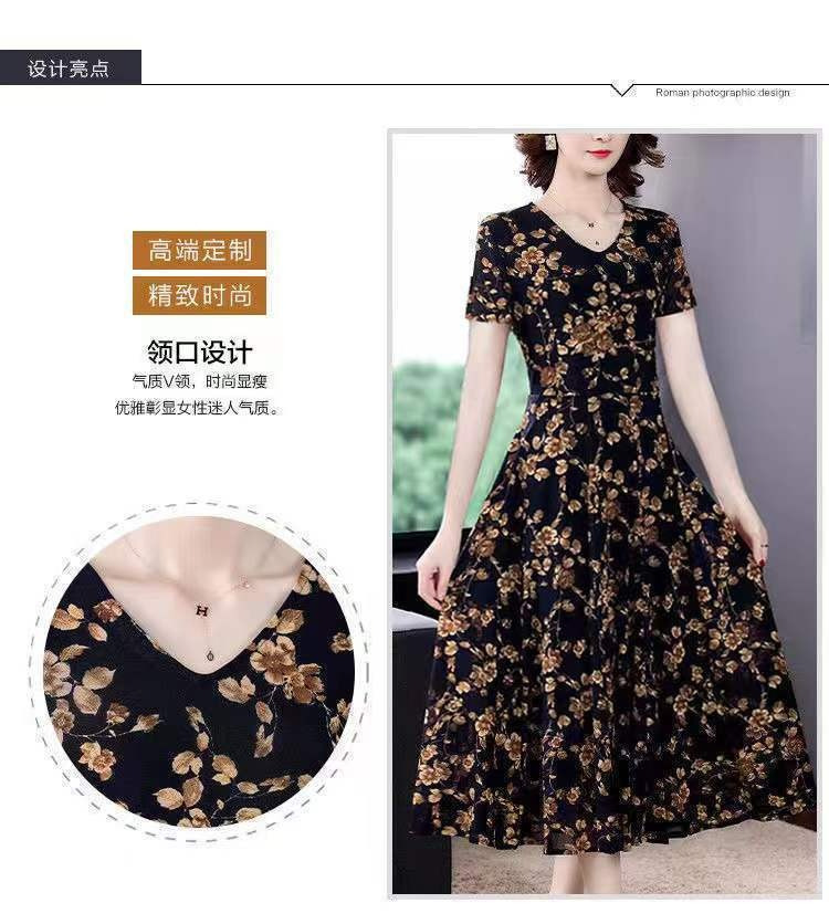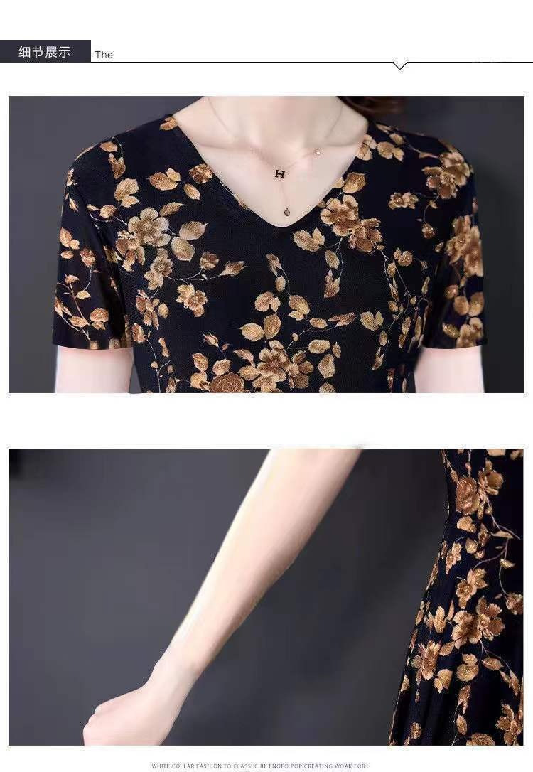 세련된 플러스 사이즈 V 넥 중장 원피스 여성 의류 새로운 여름 연령 감소 패션 어머니 중년 및 노인 풀오버 A 라인 스커트