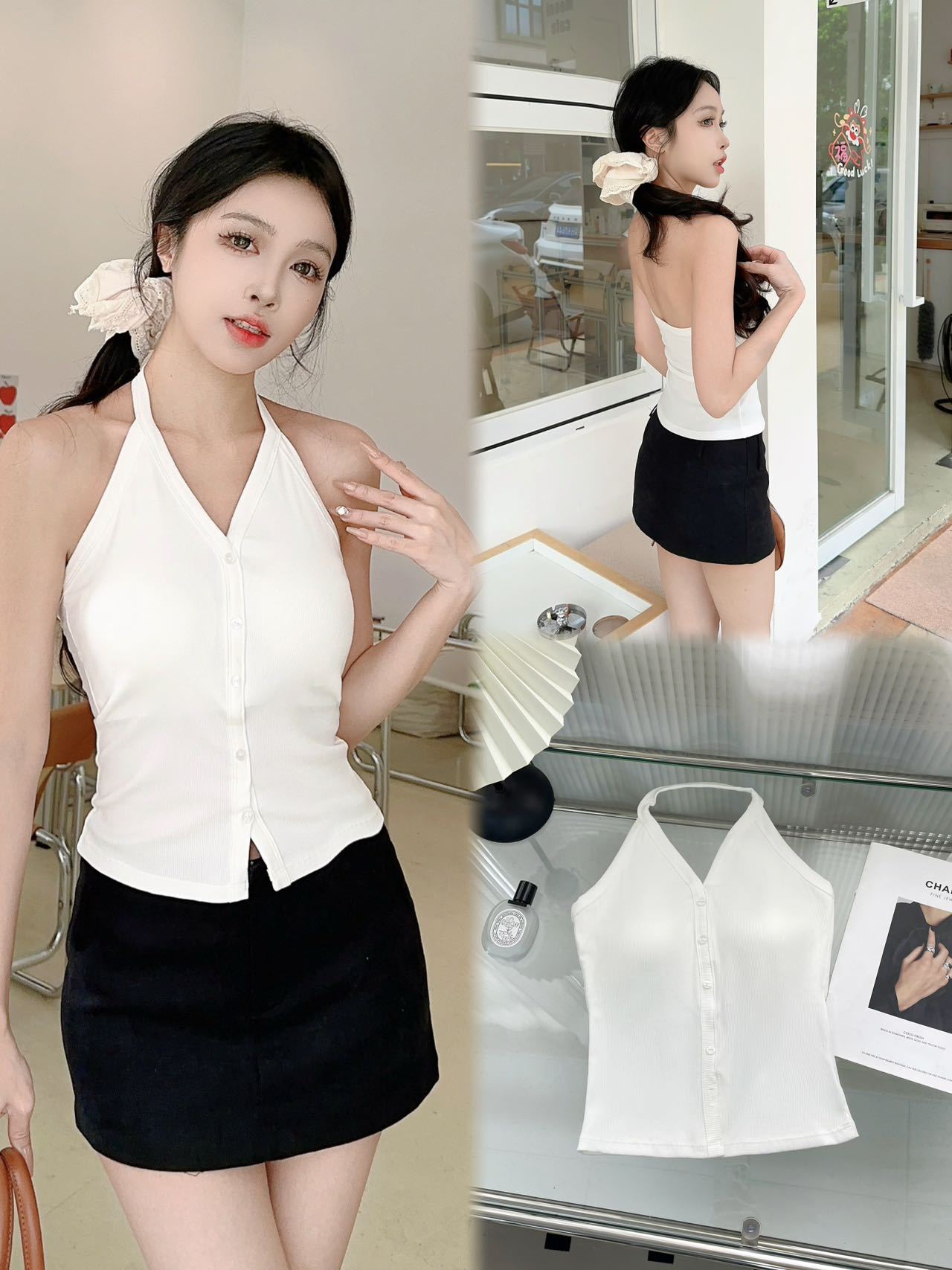8120 빈티지 순수 욕망 스타일 버튼 넥 카미 솔 여성용 슬림 핏 올 매치 셀프 포함 가슴 패드베이스 아름다운 백탑