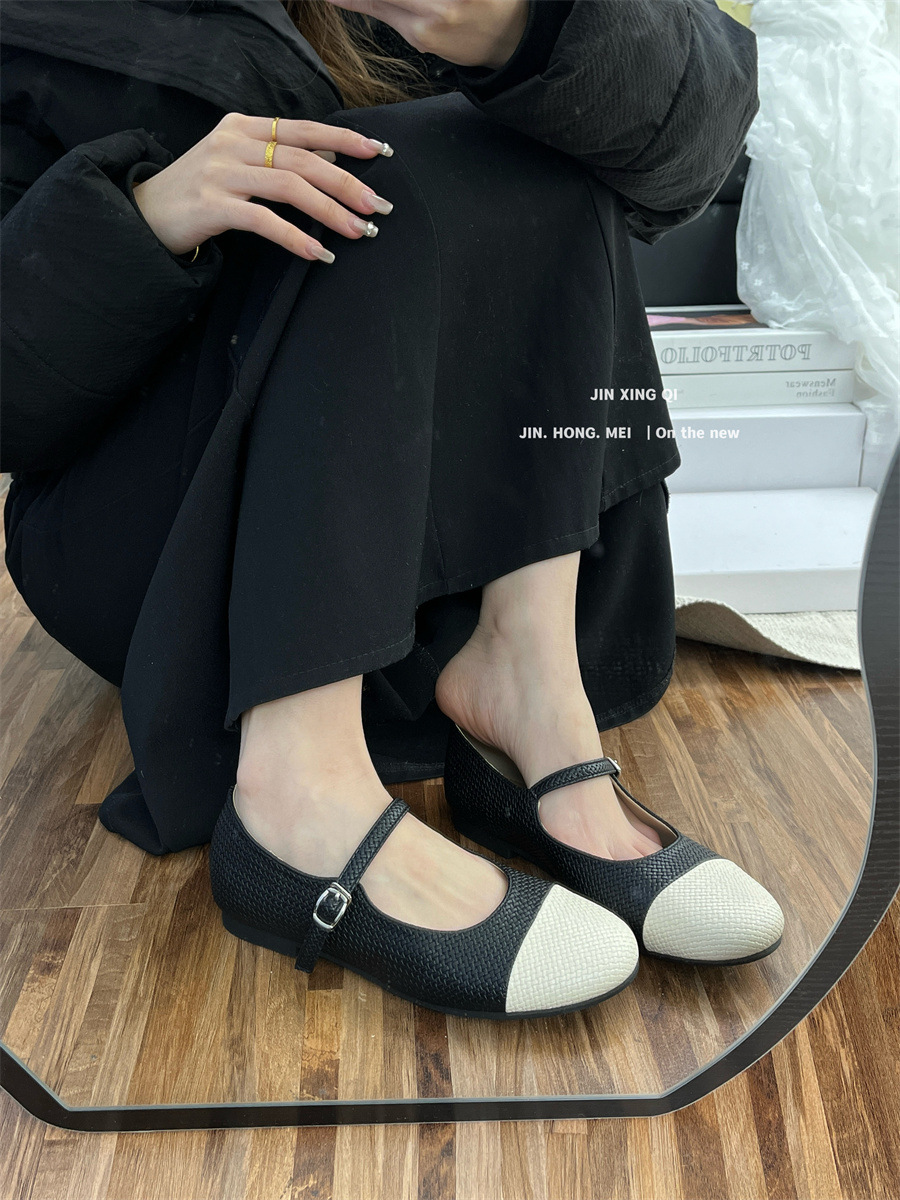 정품 가죽 한국식 메리 제인 신발 플랫 힐 여성 신발 2025 봄 새로운 라운드 발가락 패션 더블 브레스트 얕은 입스토어 가기