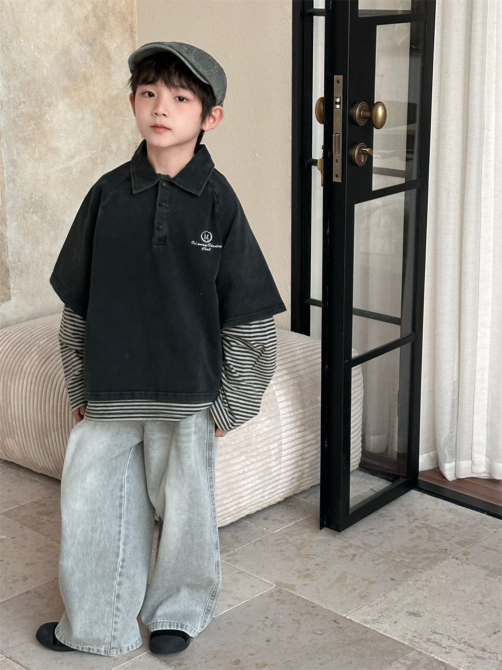 2025 새로운 가을 한국 스타일 어린이 튀김 색상 오래된 가짜 투피스 티셔츠 소년과 소녀 유행 브랜드 패션 대비 색상 긴 소매