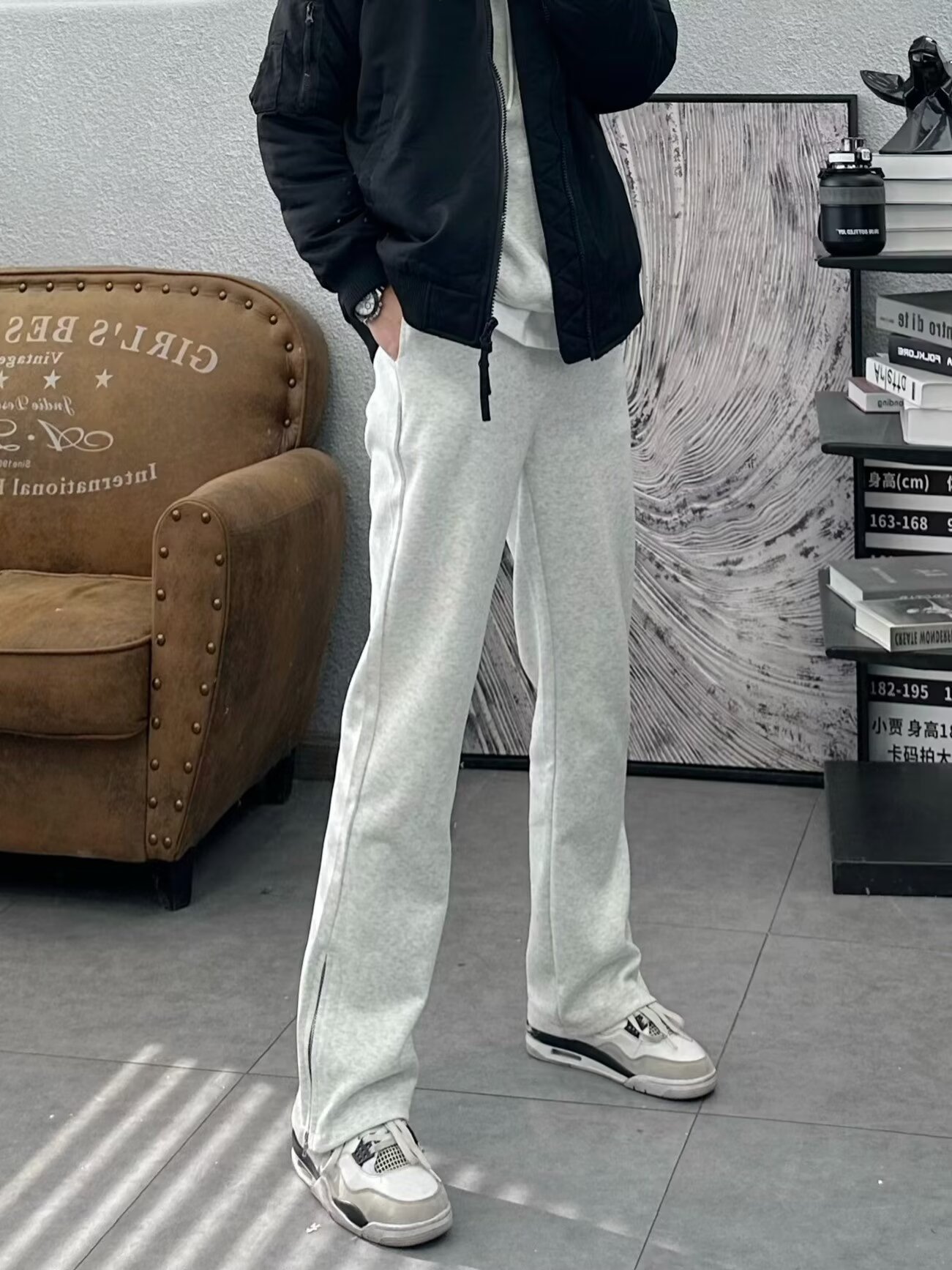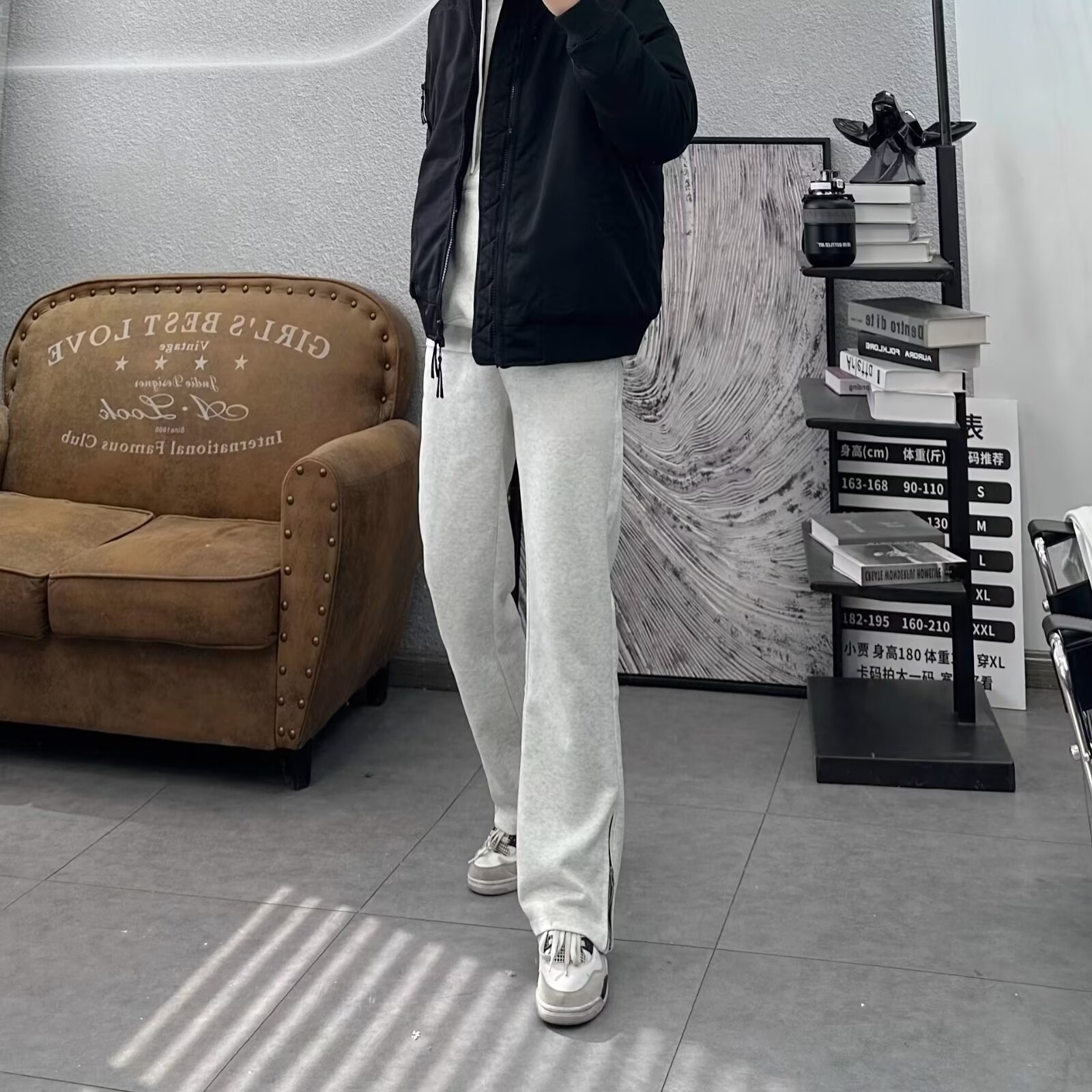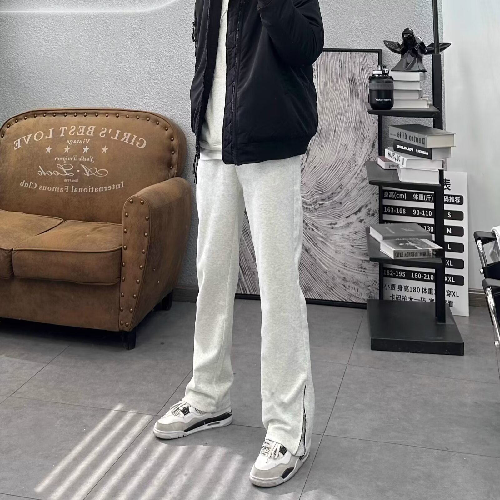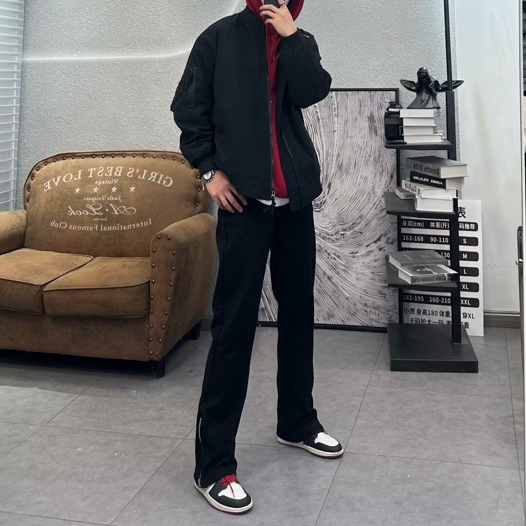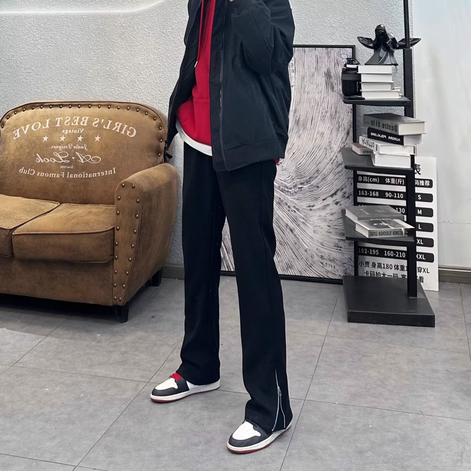 2025 폭발 지퍼 분할 바지 홍콩 스타일 트렌디 브랜드 펜던트 와이드 레그 스트레이트 바지 하이 스트리트 캐주얼 루즈 스웨트 팬츠