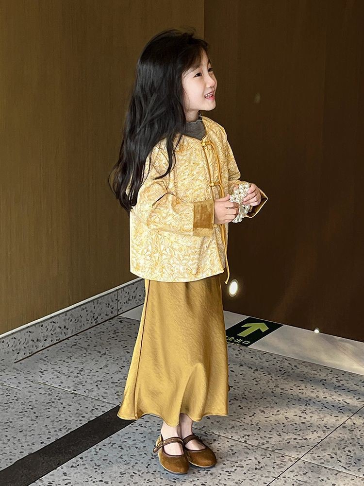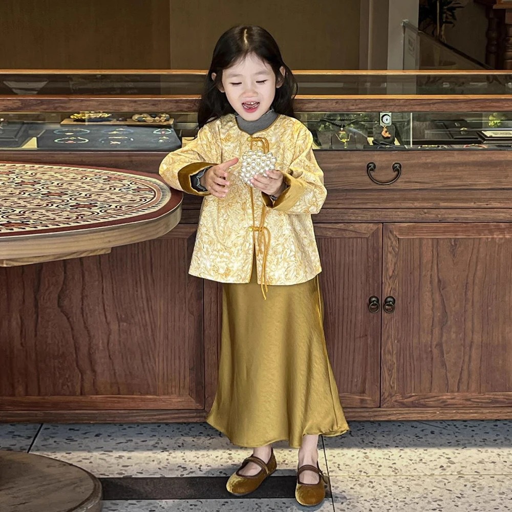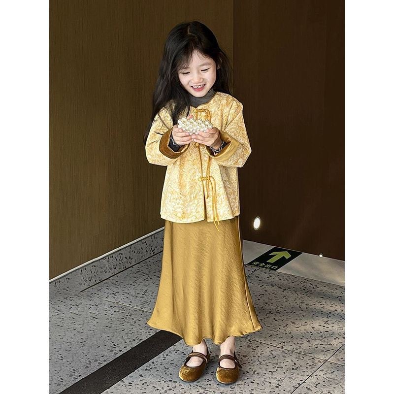 어린이 의류 소녀 새로운 중국 한후 가을 2024 새로운 어린이 국가 스타일 빈티지 버클 꽃 자켓 스커트스토어 가기