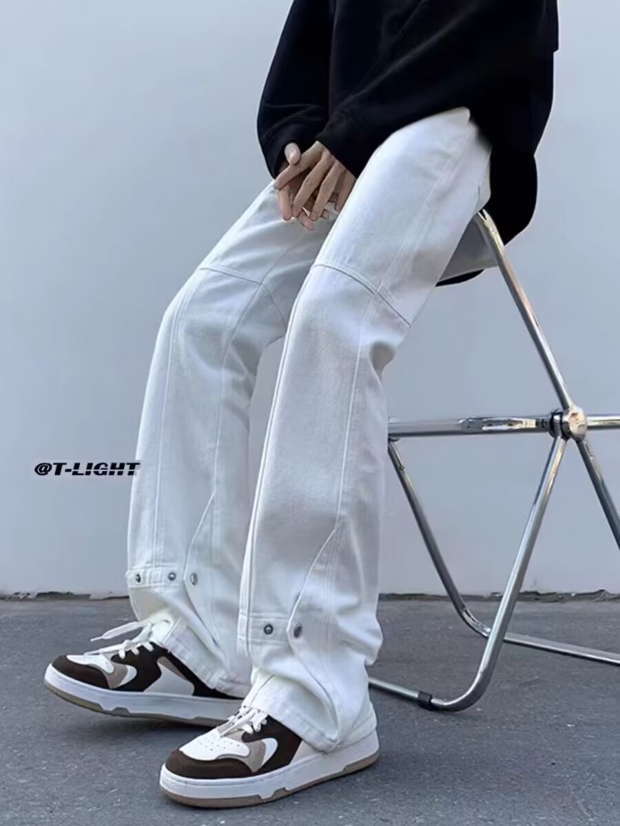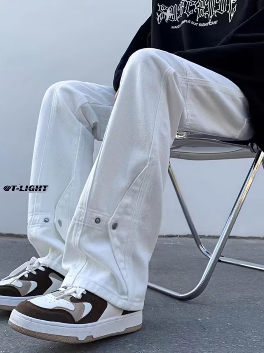 고급 화이트 청바지 아메리칸 스타일 하이 스트리트 남성 가을 얇은 디자인 센스 팬츠 느슨한 스트레이트 마이크로 바지