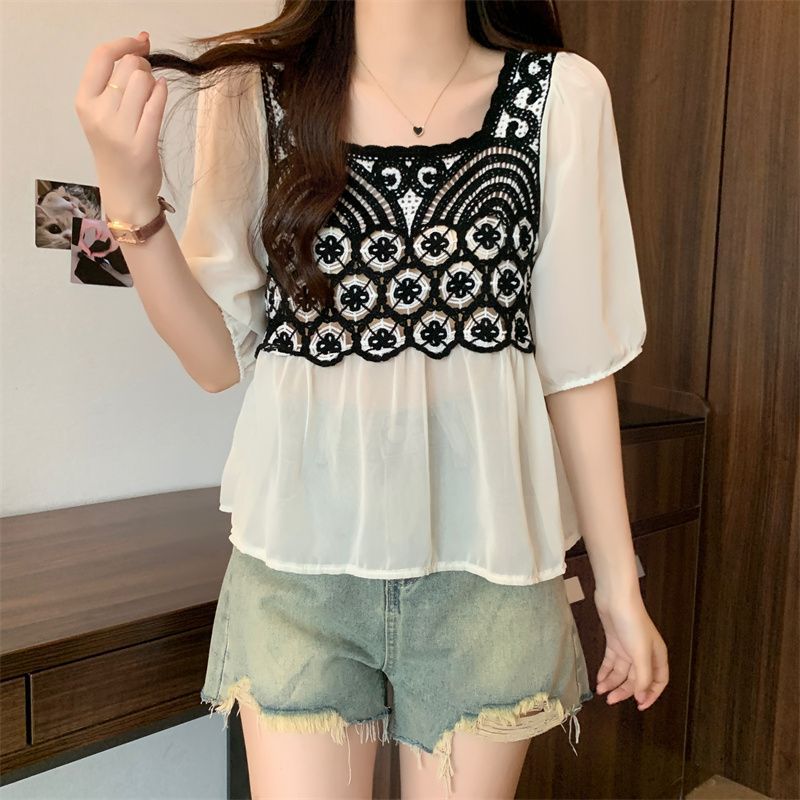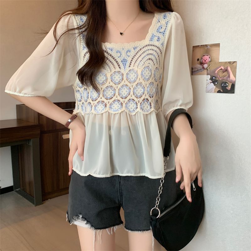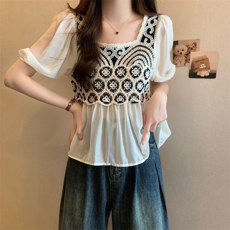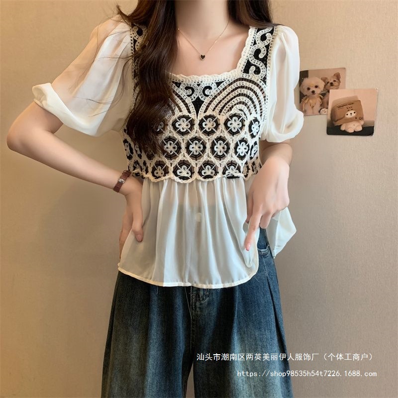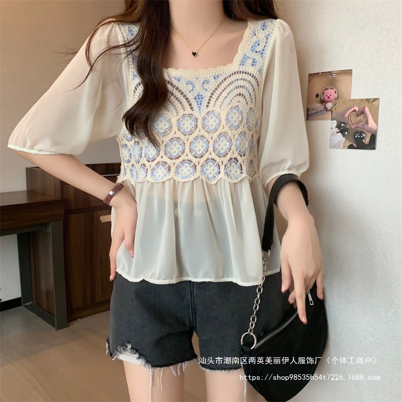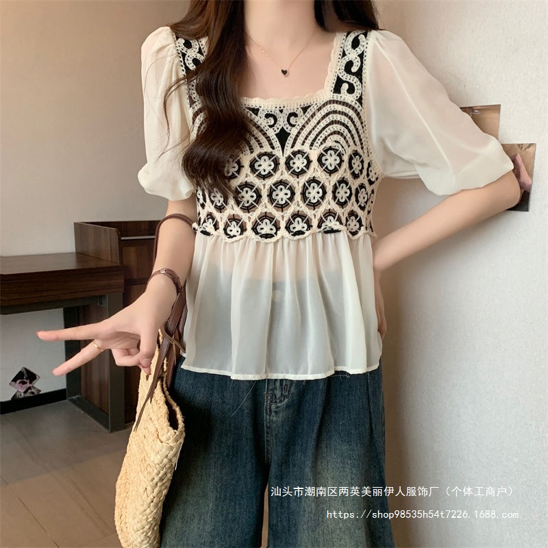 빈티지 민족 스타일 스퀘어 칼라 셔츠 여성용 스티칭 메쉬 버블 슬리브 블라우스 작은 탑 벨리 커버 슬리밍 쉬폰 셔츠