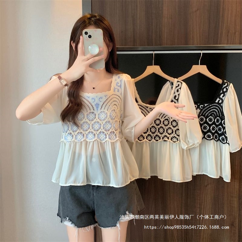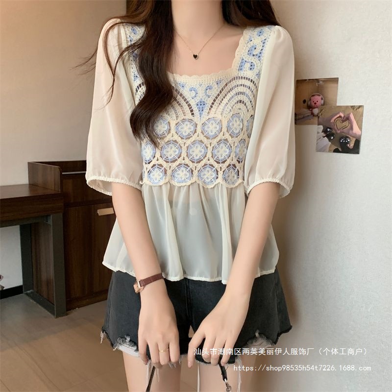 빈티지 민족 스타일 스퀘어 칼라 셔츠 여성용 스티칭 메쉬 버블 슬리브 블라우스 작은 탑 벨리 커버 슬리밍 쉬폰 셔츠스토어 가기