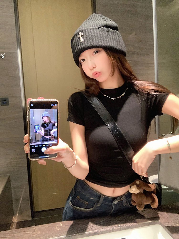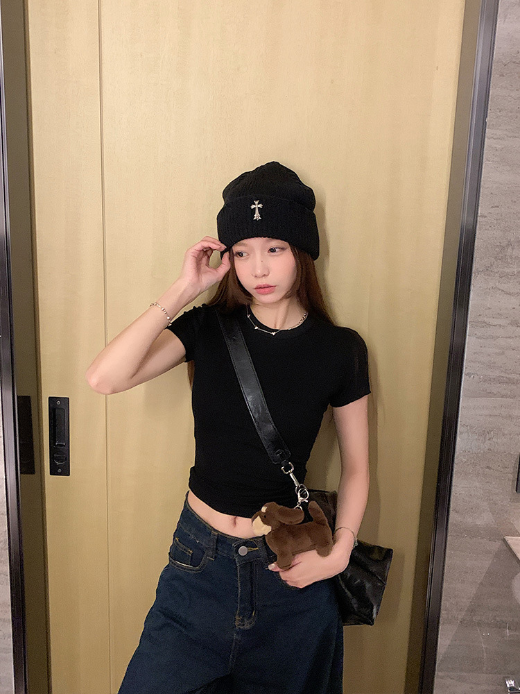 실제 샷 재고 슬림 크루 넥 쇼트 슬리브 티셔츠 여성용 타이트한 2025 년 봄과 여름 육류로 덮은베이스 코트스토어 가기