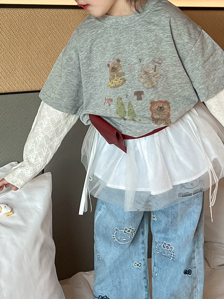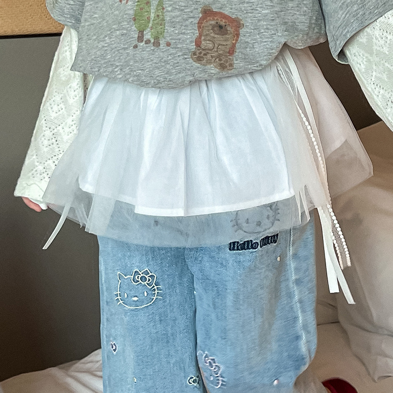 소녀 패치 워크 니트 소매 만화 티셔츠 탑 귀여운 자수 키티 청바지 메쉬 짧은 치마 방귀 커튼 세트