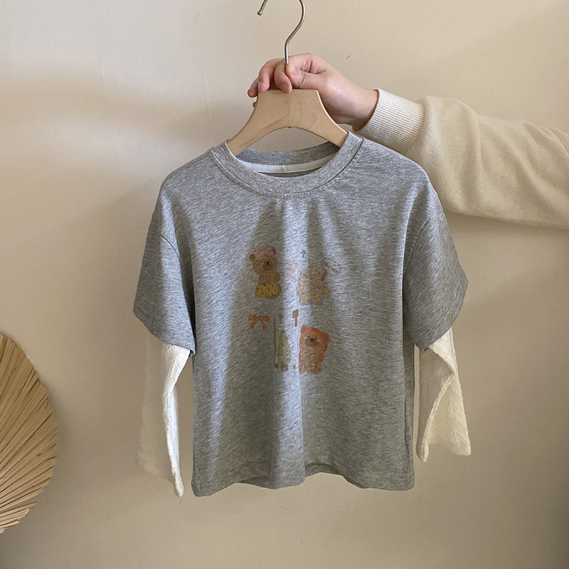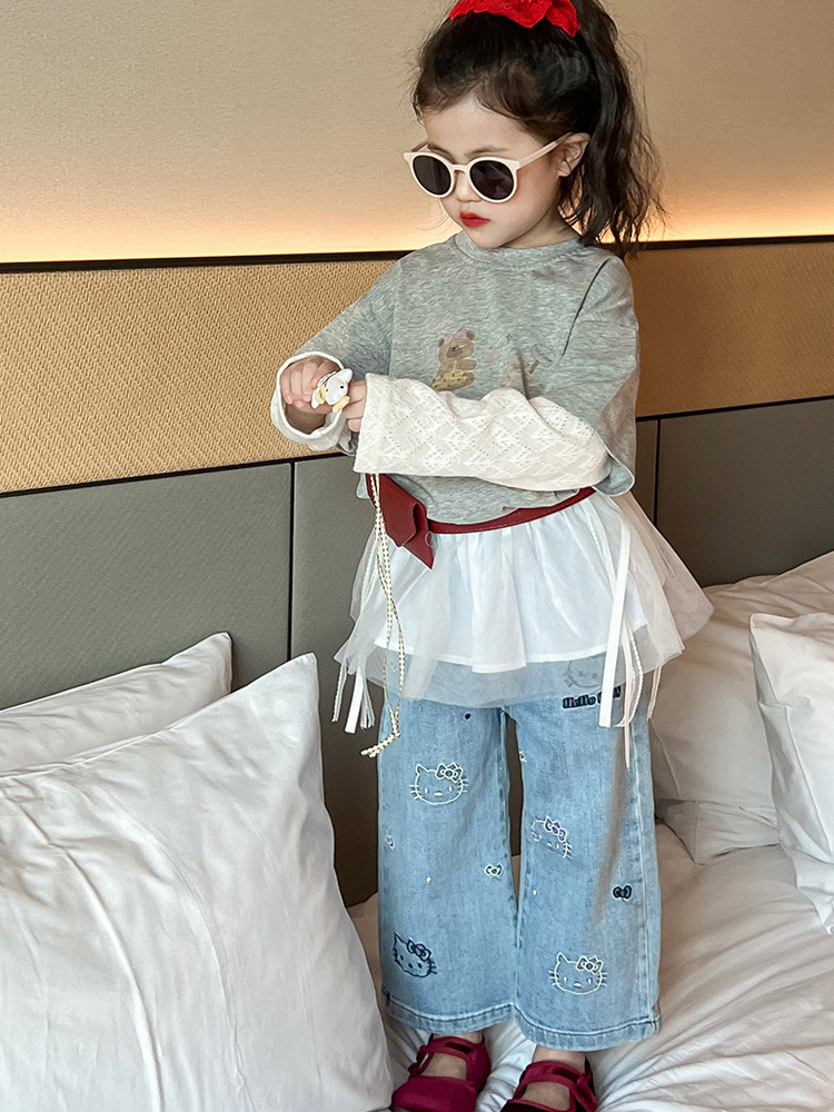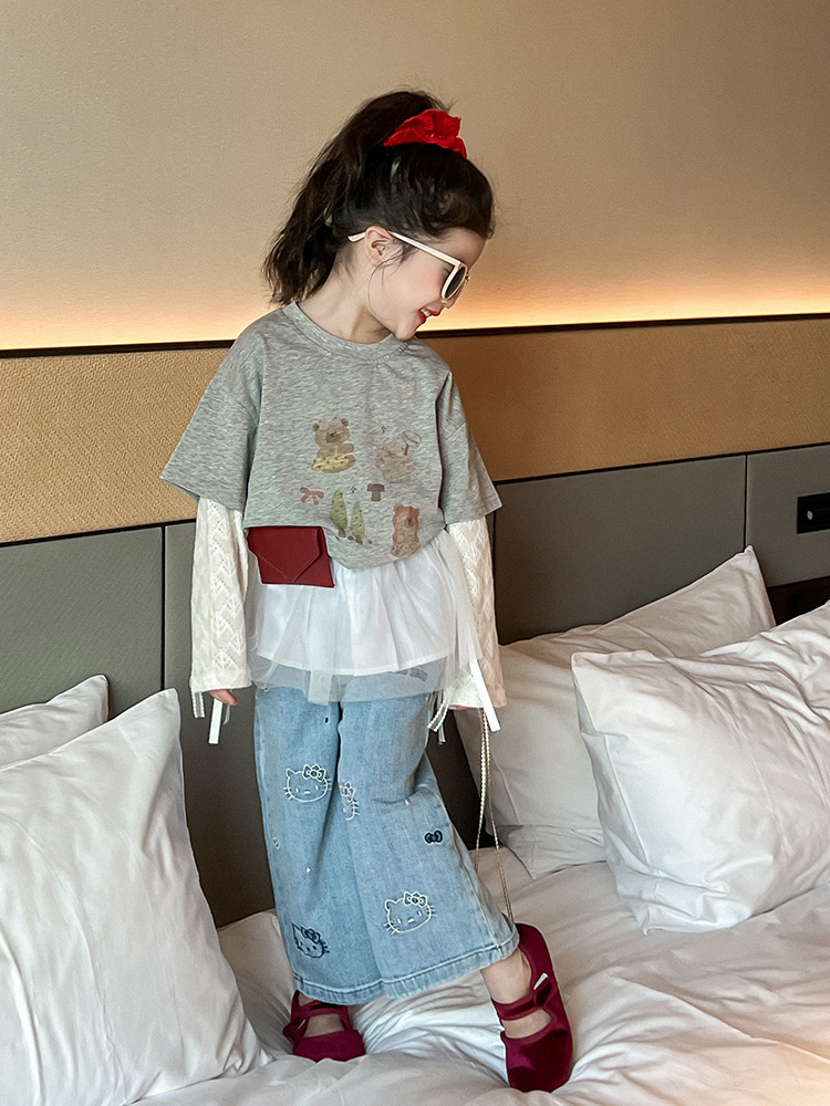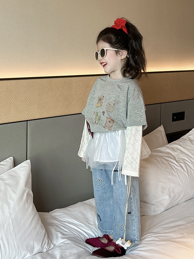 소녀 패치 워크 니트 소매 만화 티셔츠 탑 귀여운 자수 키티 청바지 메쉬 짧은 치마 방귀 커튼 세트스토어 가기