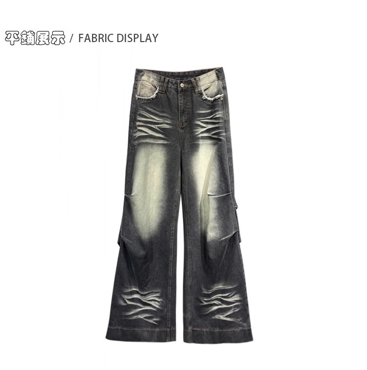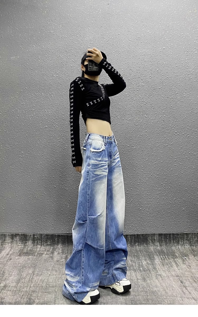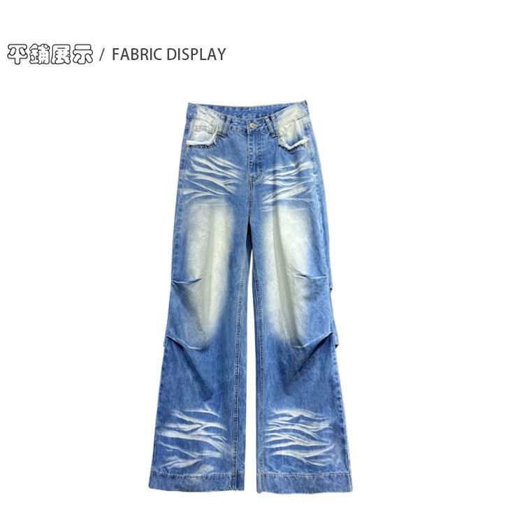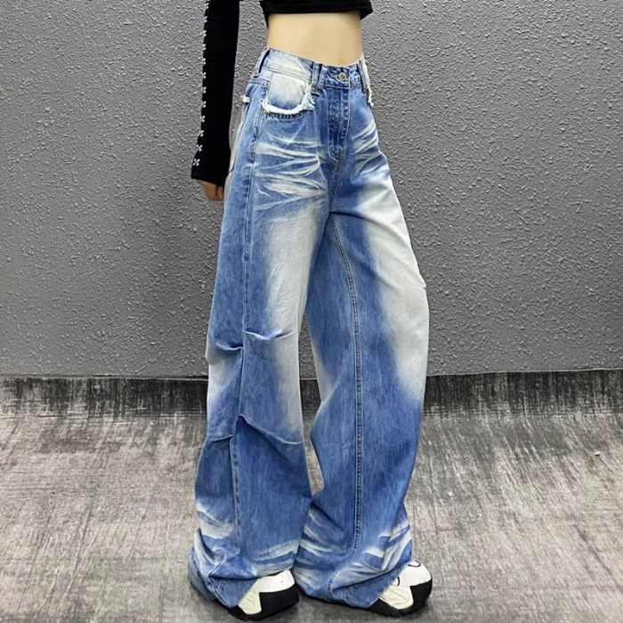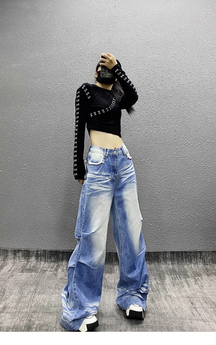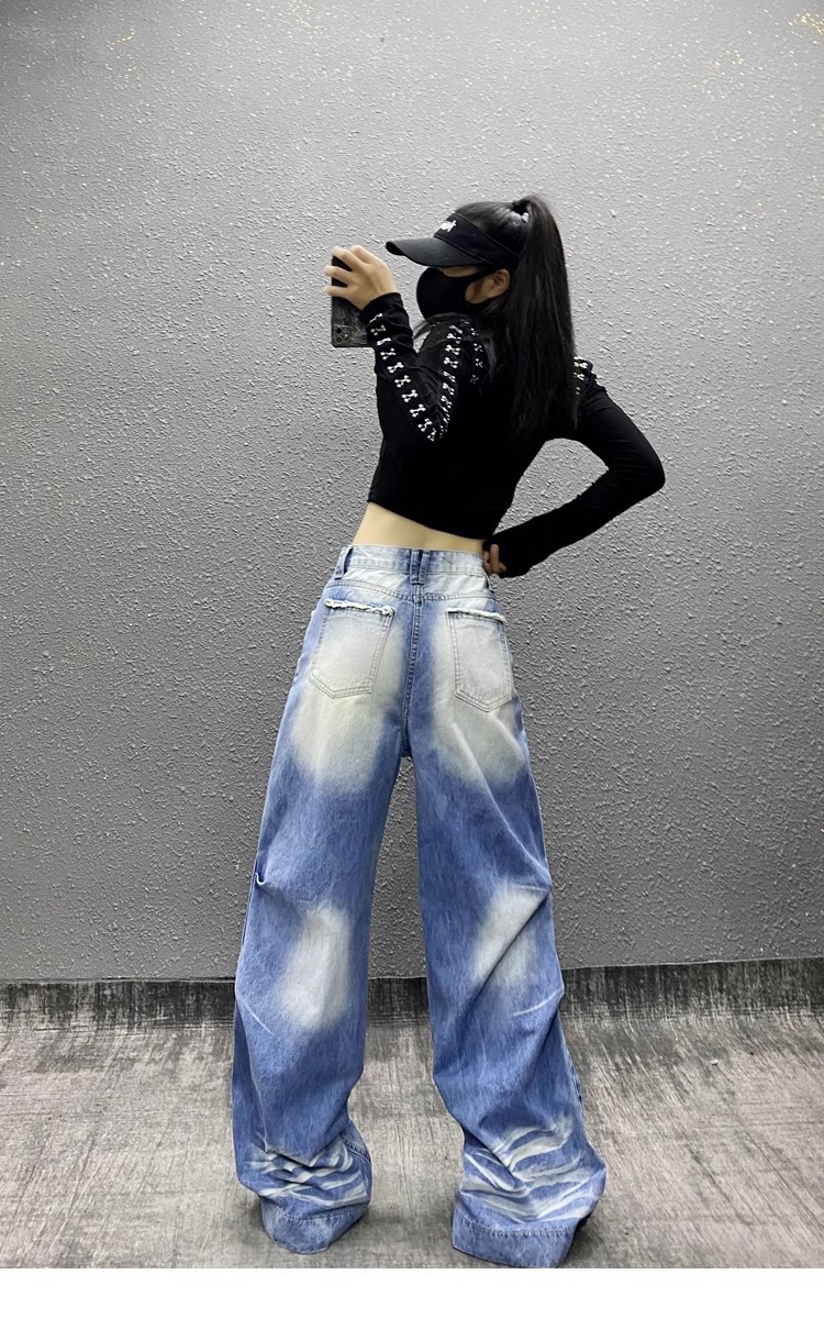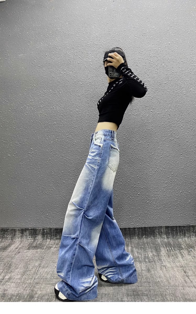 잘 생긴 타이-염료 주름 디자인 넓은 다리 청바지 여성의 2025 새로운 높은 허리 느슨한 슬리밍 스트레이트 다리 바지스토어 가기