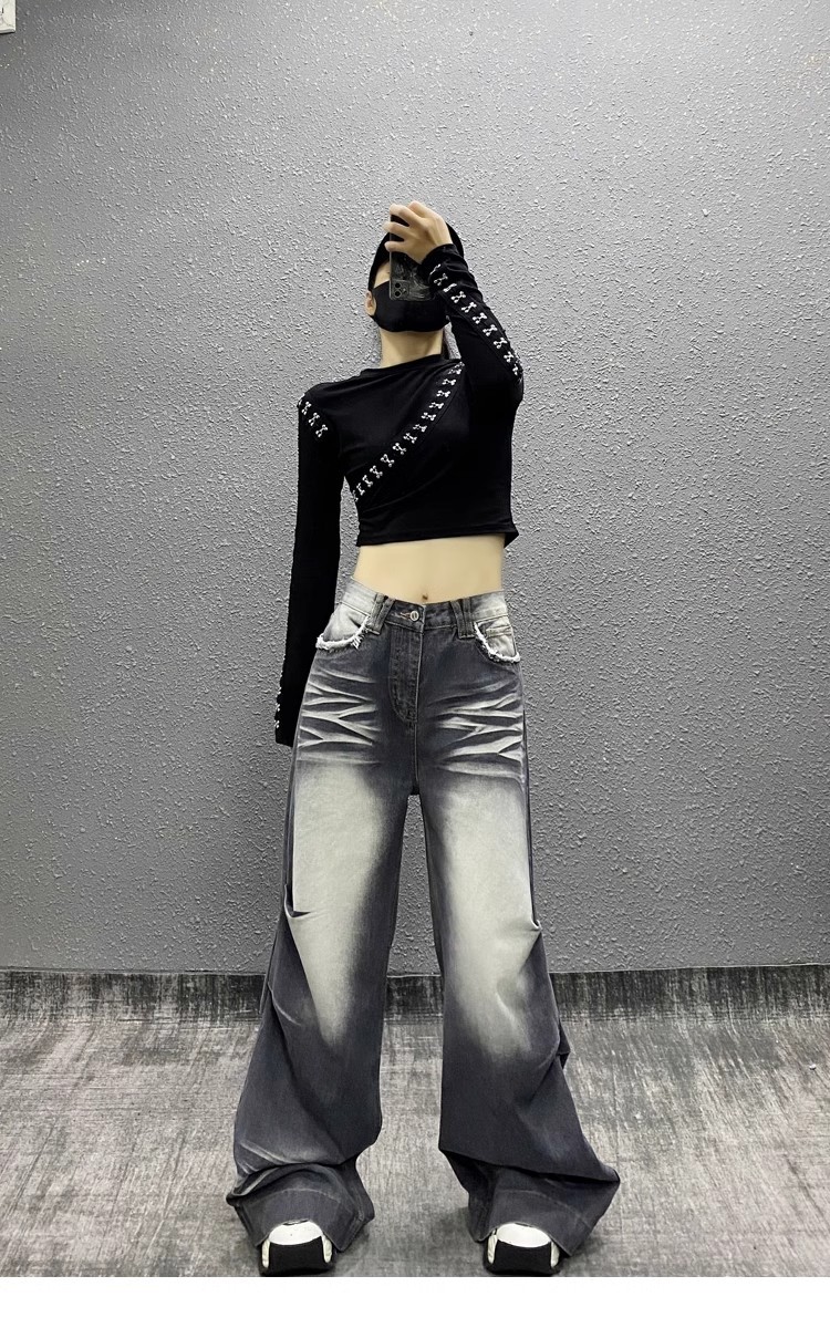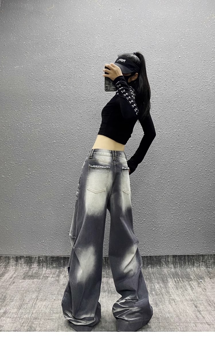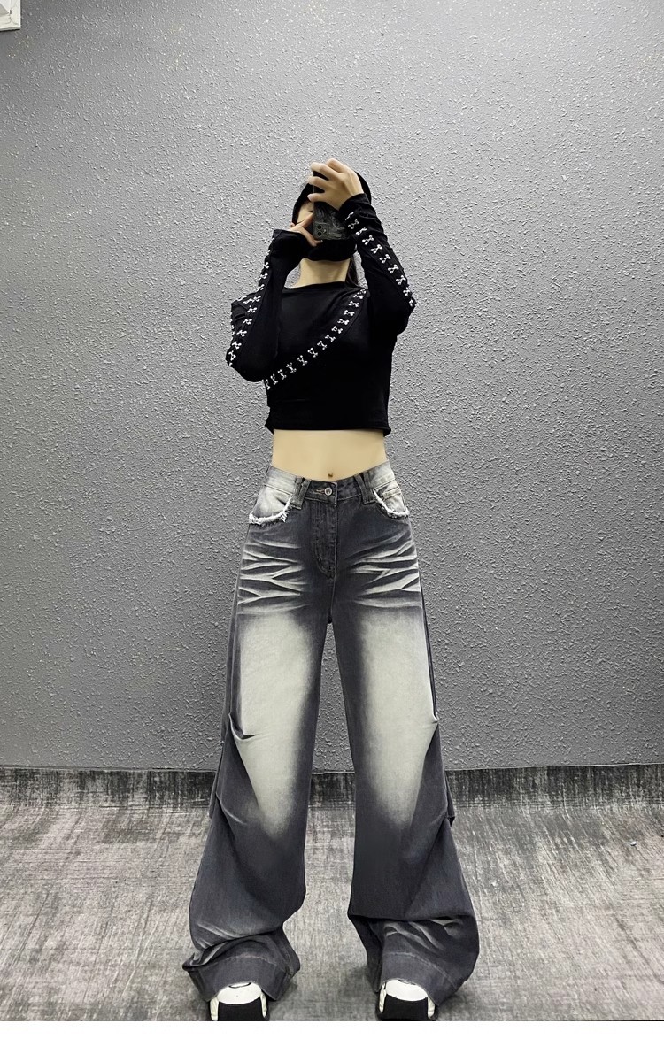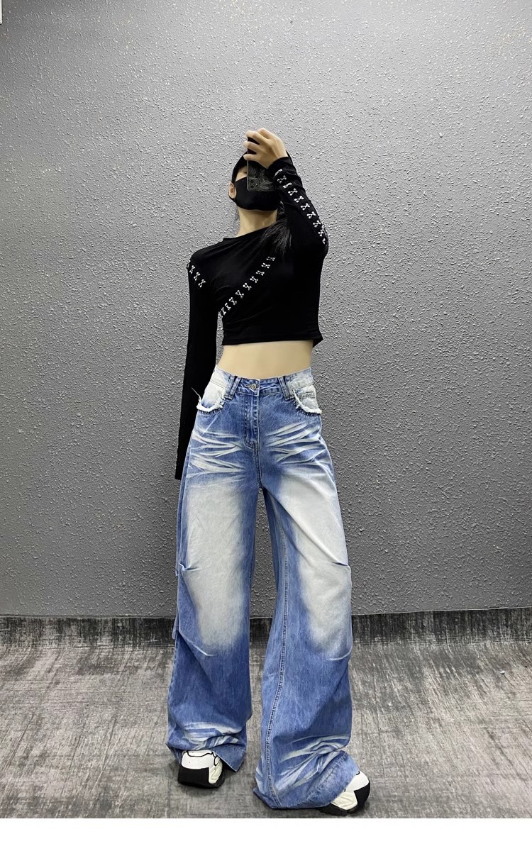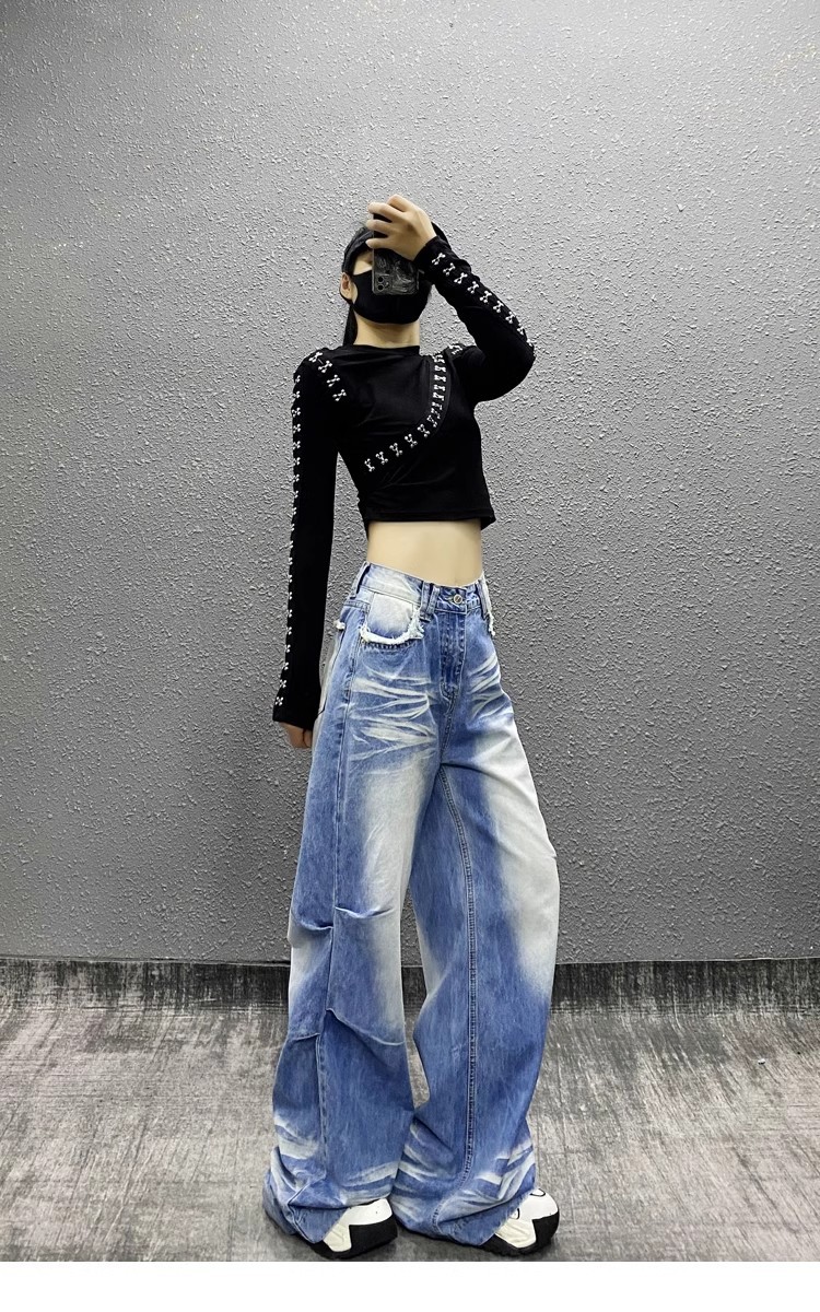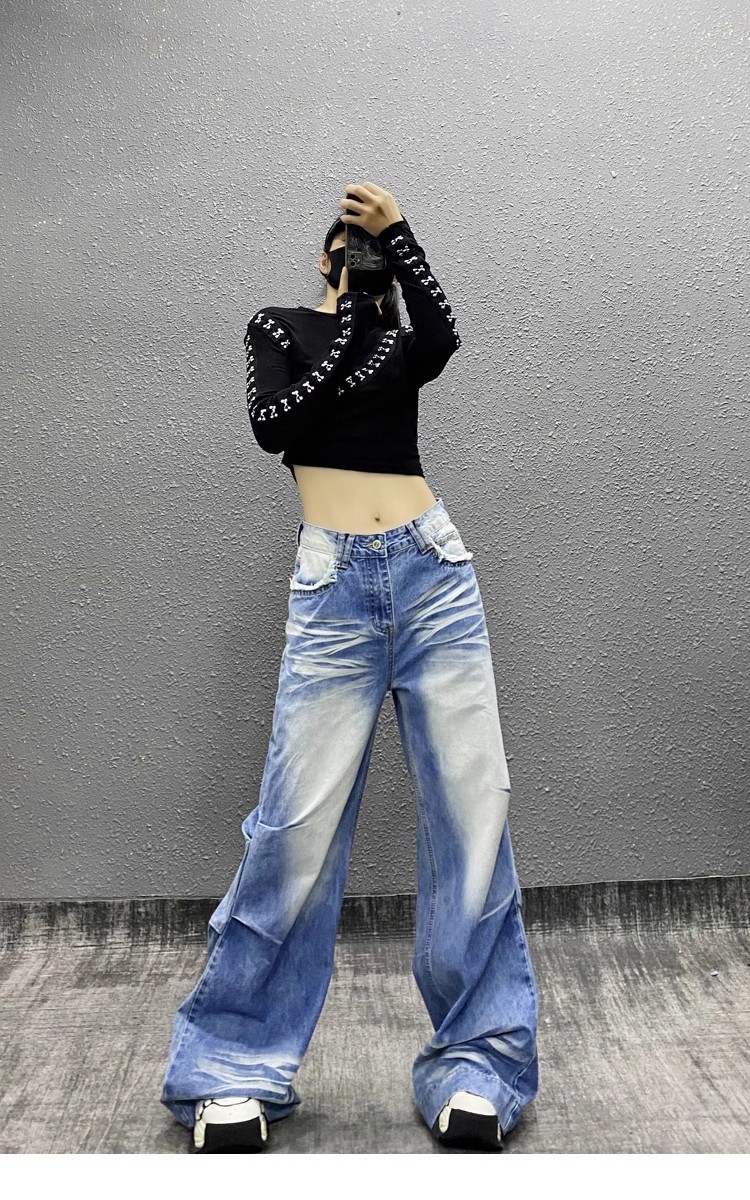 잘 생긴 타이-염료 주름 디자인 넓은 다리 청바지 여성의 2025 새로운 높은 허리 느슨한 슬리밍 스트레이트 다리 바지스토어 가기