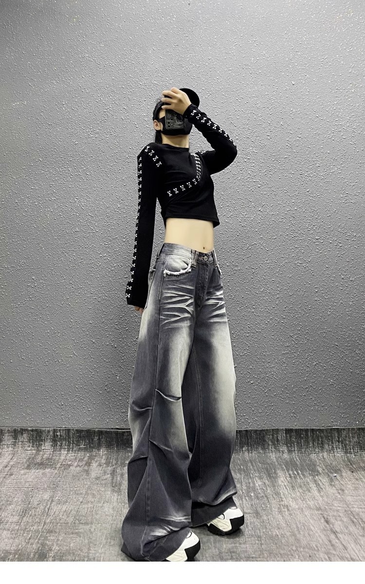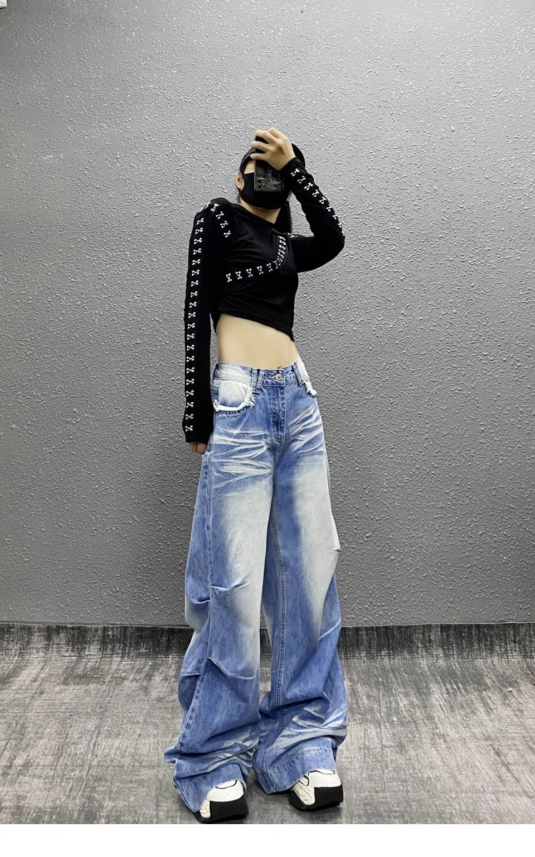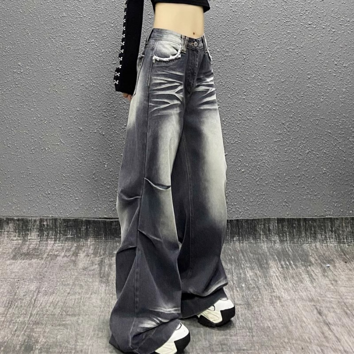 잘 생긴 타이-염료 주름 디자인 넓은 다리 청바지 여성의 2025 새로운 높은 허리 느슨한 슬리밍 스트레이트 다리 바지