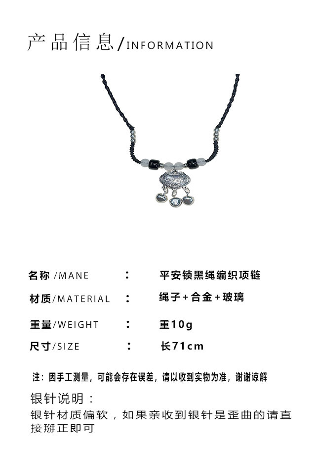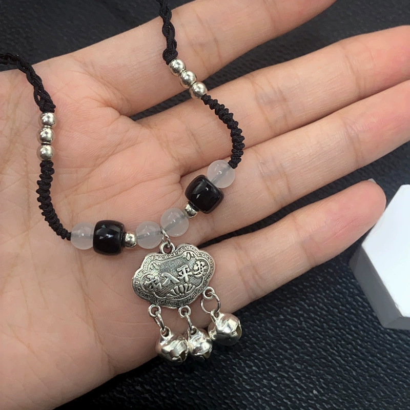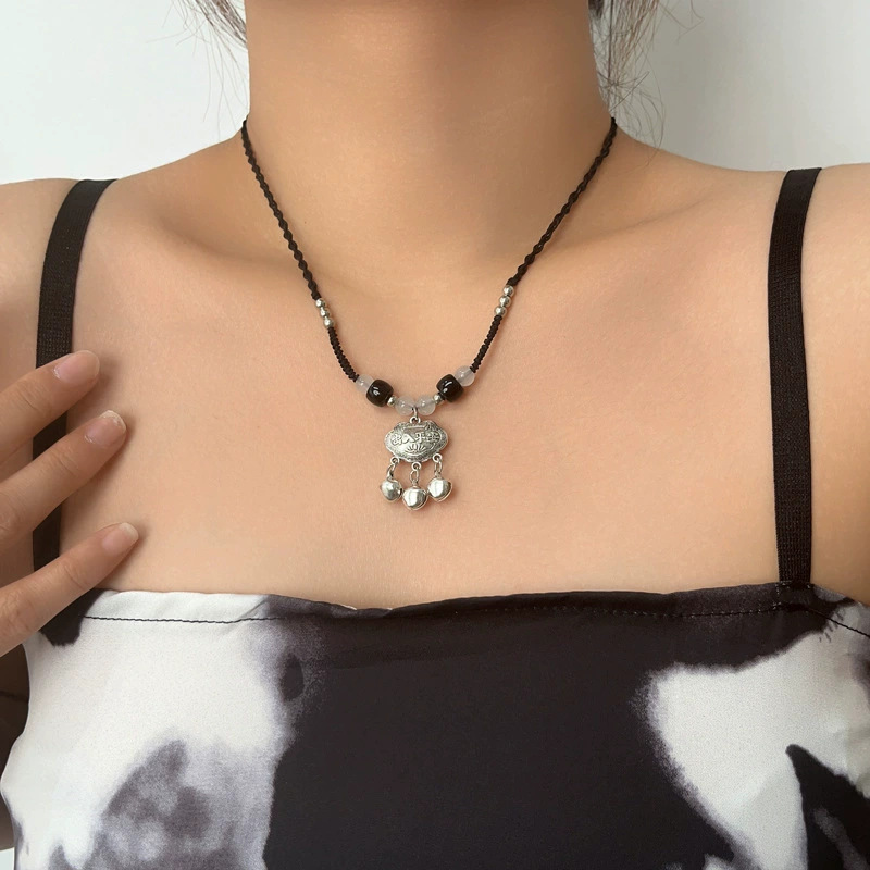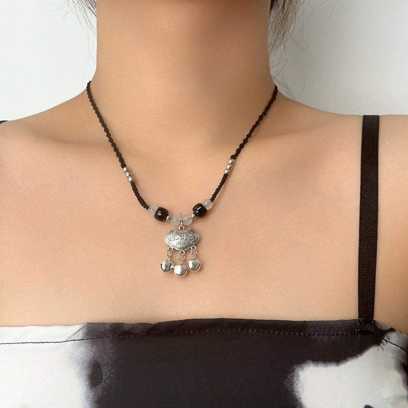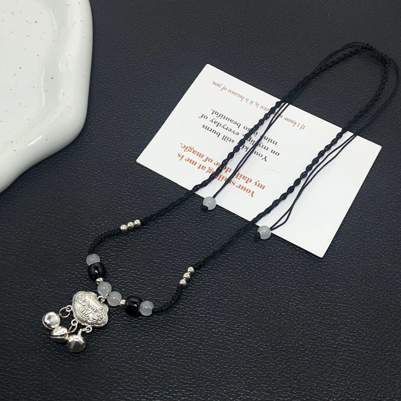 새로운 중국 스타일 핑 잠금 벨 펜던트 블랙 로프 짠 목걸이 남성과 여성을위한 틈새 디자인 구슬 모직 체인 목걸이스토어 가기