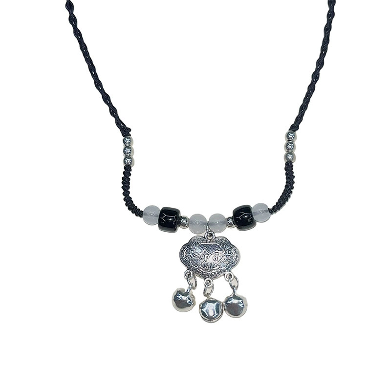 새로운 중국 스타일 핑 잠금 벨 펜던트 블랙 로프 짠 목걸이 남성과 여성을위한 틈새 디자인 구슬 모직 체인 목걸이