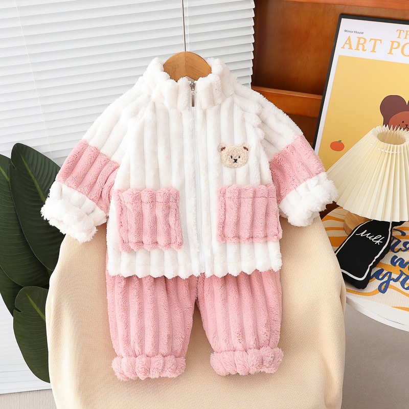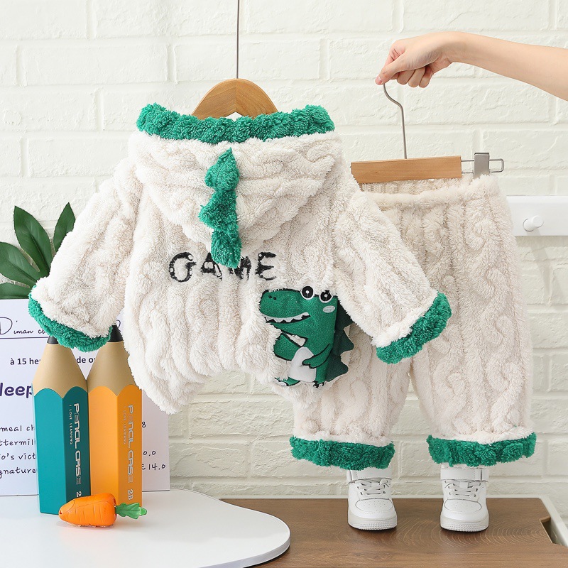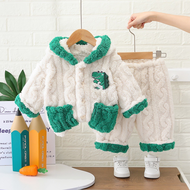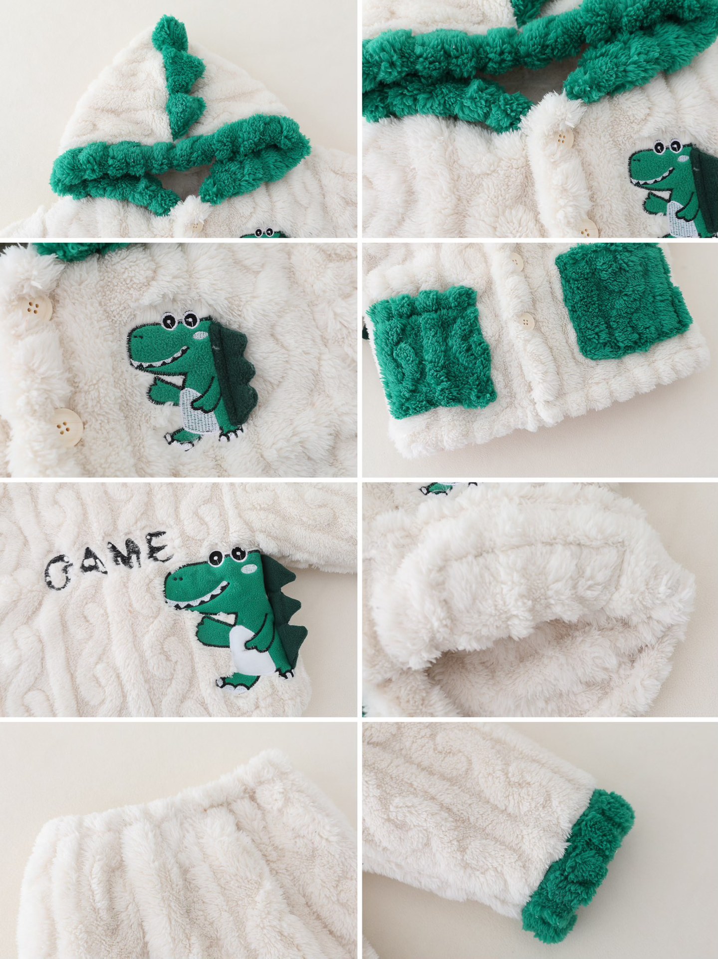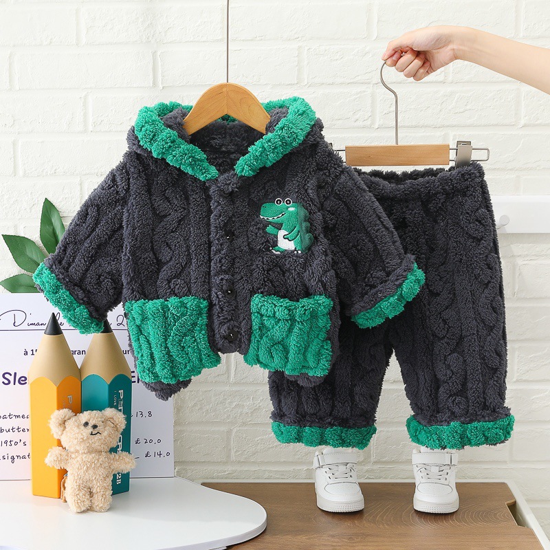 2025 새로운 어린이 겨울 홈 잠옷 아기 소년 겨울 두꺼운 공룡 후드 가디건 플러시 홈 의류