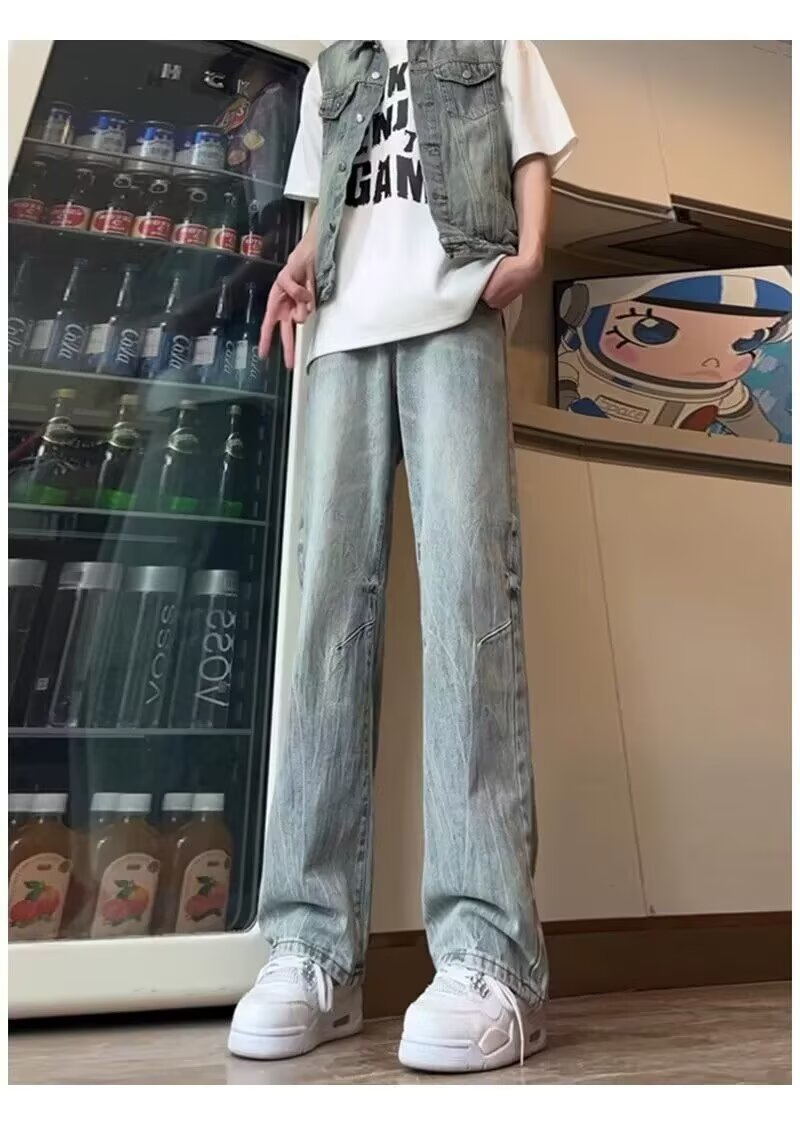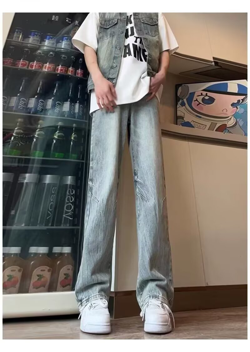 아메리칸 스타일 레트로 라이트 블루 청바지 소년 플러스 사이즈 여름 얇은 트렌디 브랜드 세척 스트레이트 마이크로 핏 루즈 바지스토어 가기