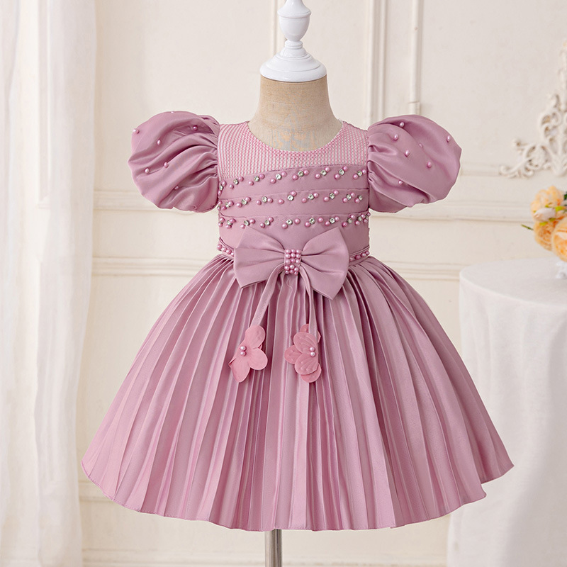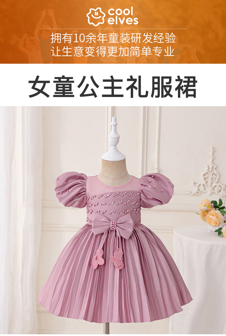 2025节日宴会晚礼服泡泡袖女孩公主裙子宝宝珍珠蝴蝶结女童连衣裙