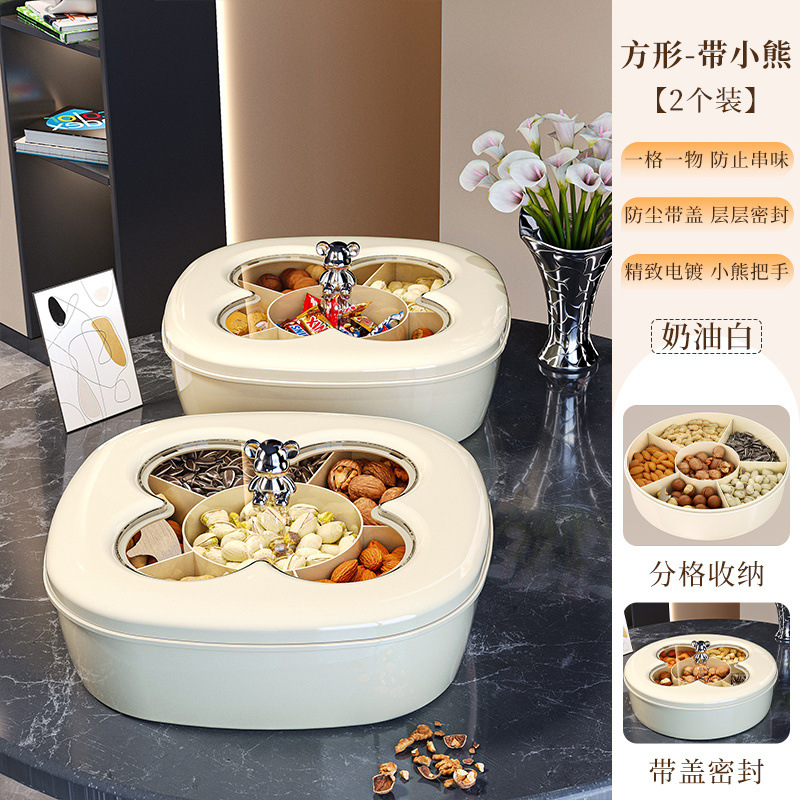 • 라이트 럭셔리 크림 화이트 [사각형 스타일] 밀봉 건조 과일 접시 - 손잡이 스타일 [칸막이 수납/방진 커버 포함] 2개 팩