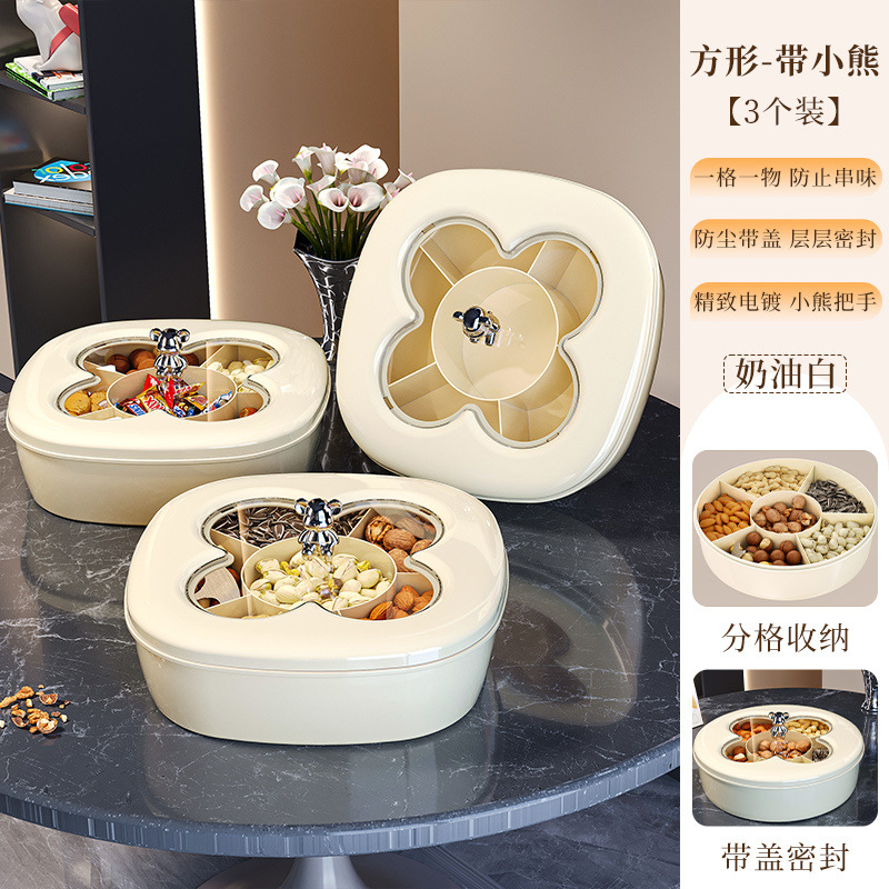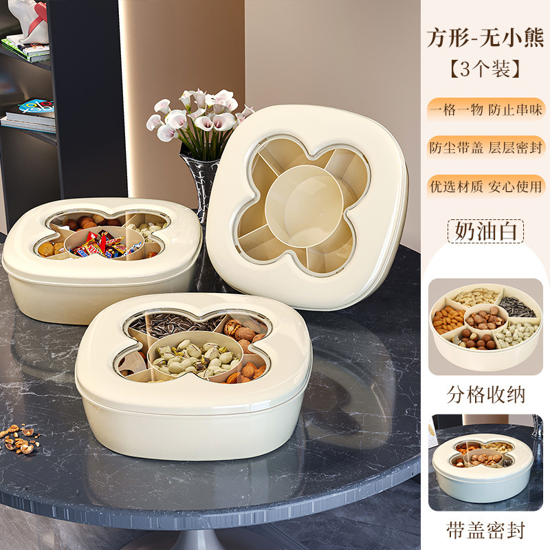 • 라이트 럭셔리 크림 화이트 [사각형 스타일] 밀봉 건조 과일 접시 - 손잡이 스타일 [칸막이 수납/방진 커버 포함] 3개 팩