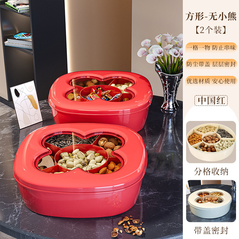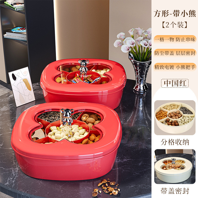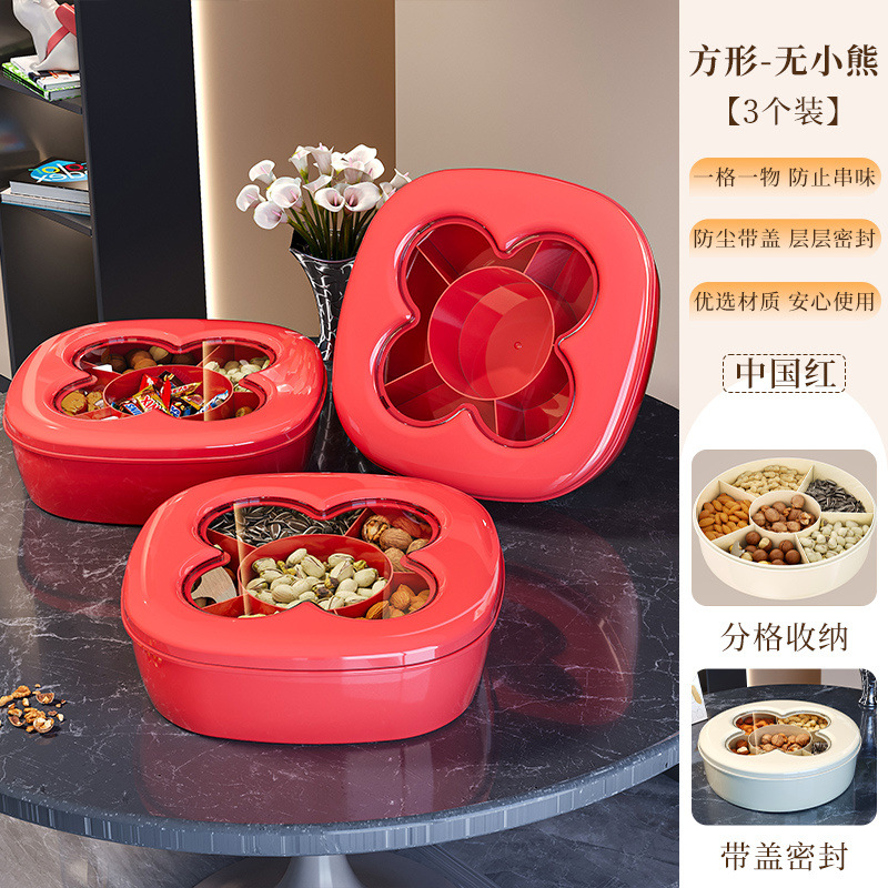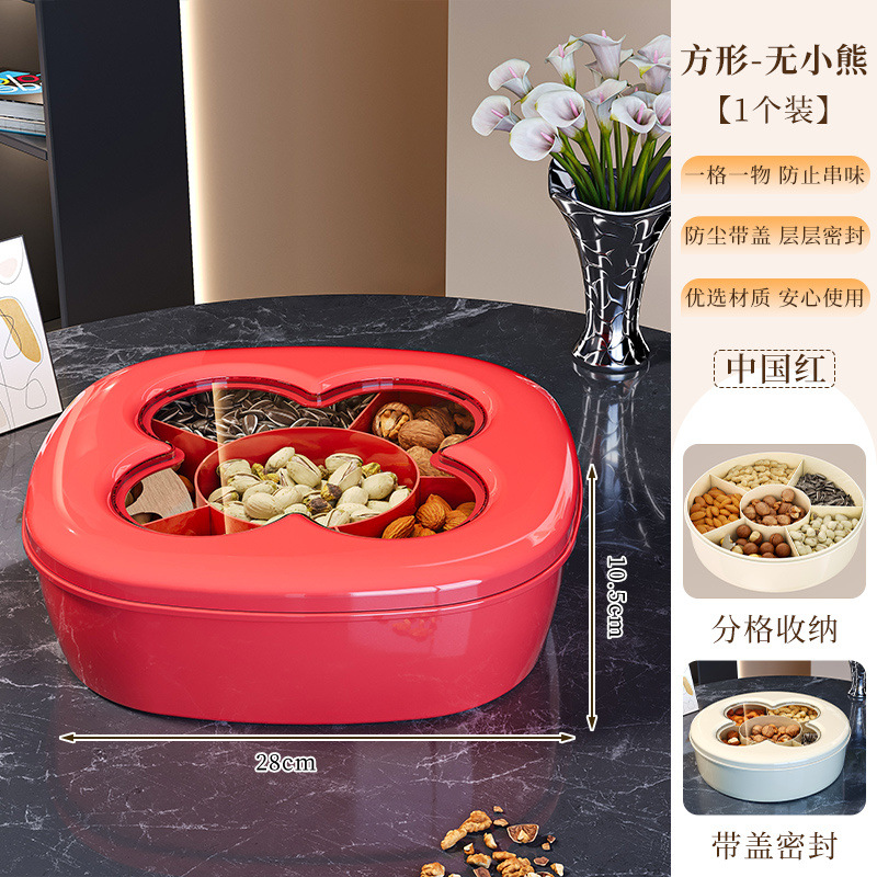 • 클래식 차이니즈 레드 [스퀘어 스타일] 밀봉된 말린 과일 접시 - 손잡이 스타일 [칸막이 수납/방진 커버 포함] 1팩