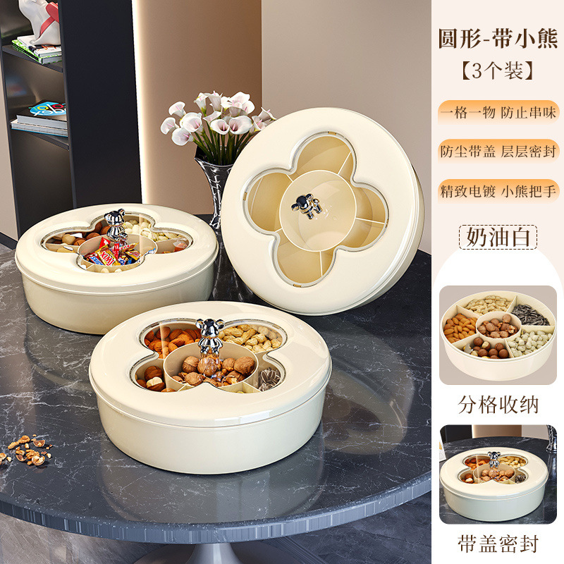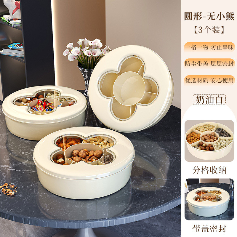 • 라이트 럭셔리 크림 화이트 [둥근 스타일] 밀봉된 말린 과일 접시 - 손잡이 없음 [칸막이 수납/방진 커버 포함] 3개 팩