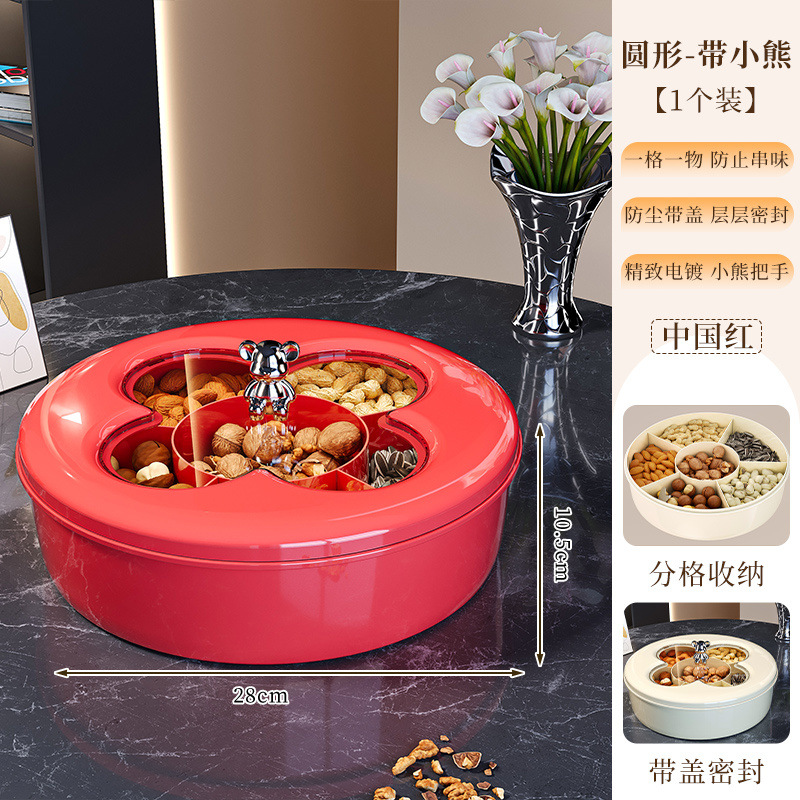 • 클래식 차이니즈 레드 [둥근 스타일] 밀폐형 말린 과일 접시 - 손잡이 스타일 [칸막이 수납/방진 커버 포함] 1팩