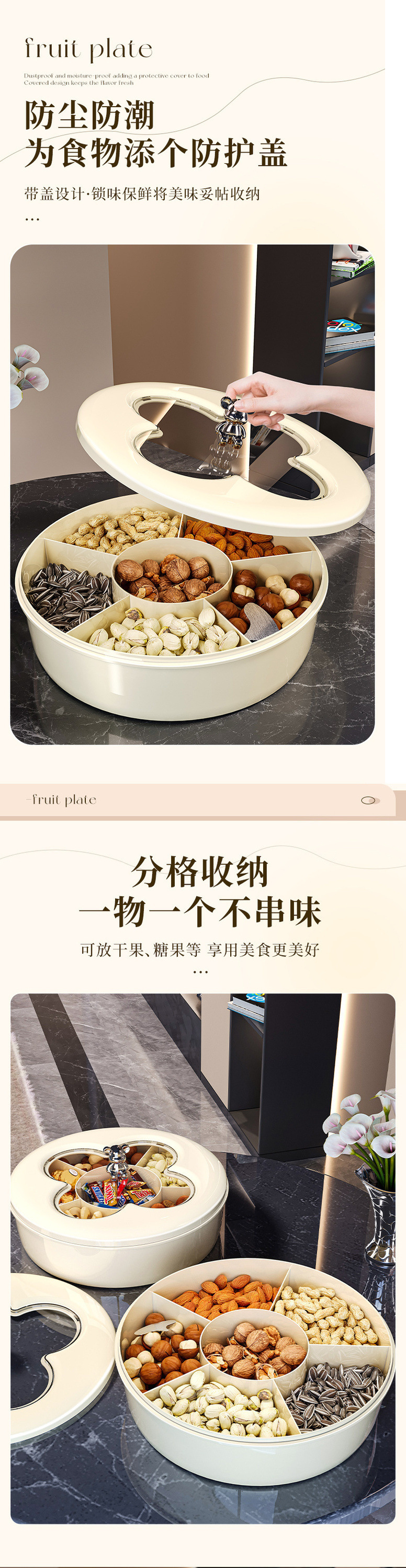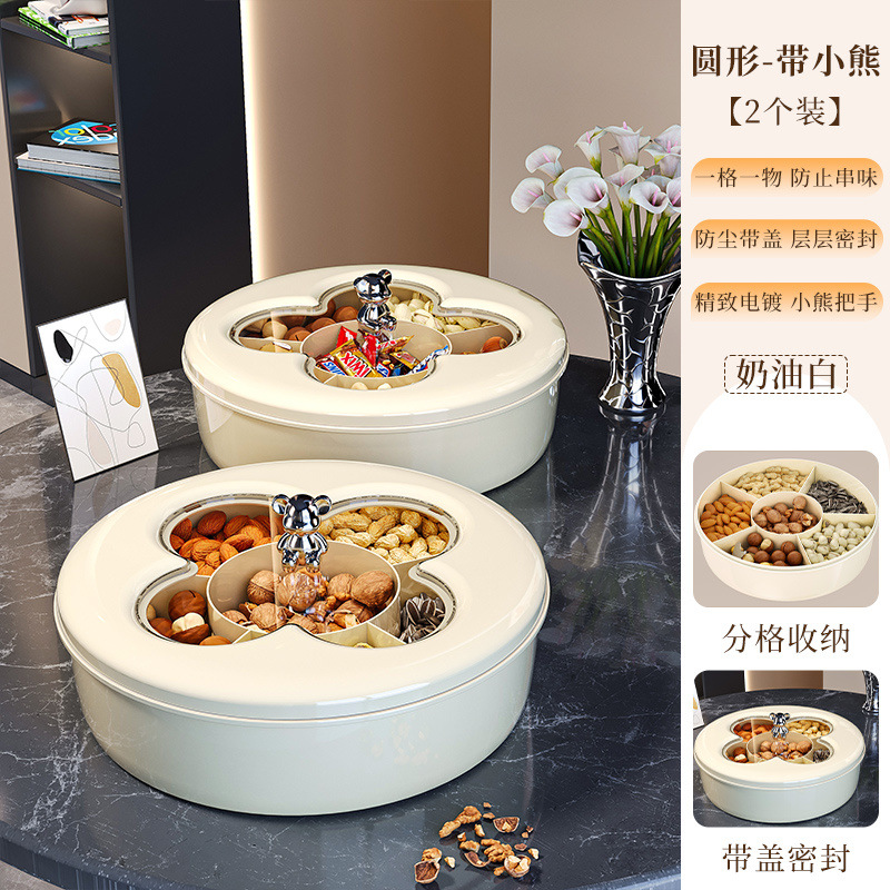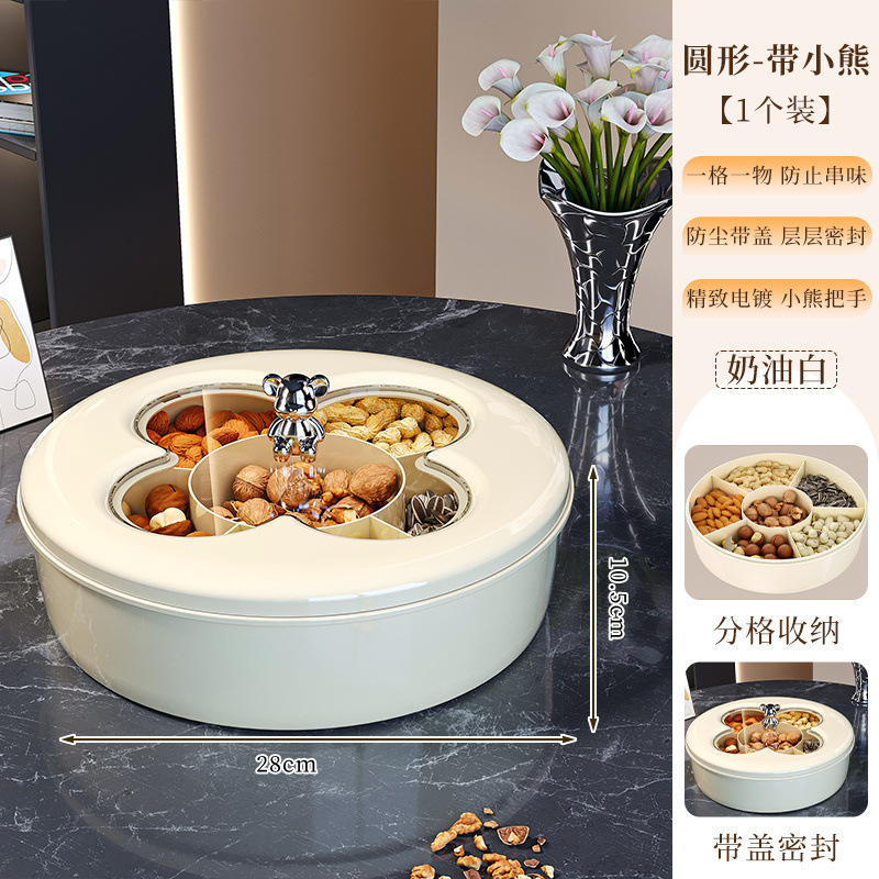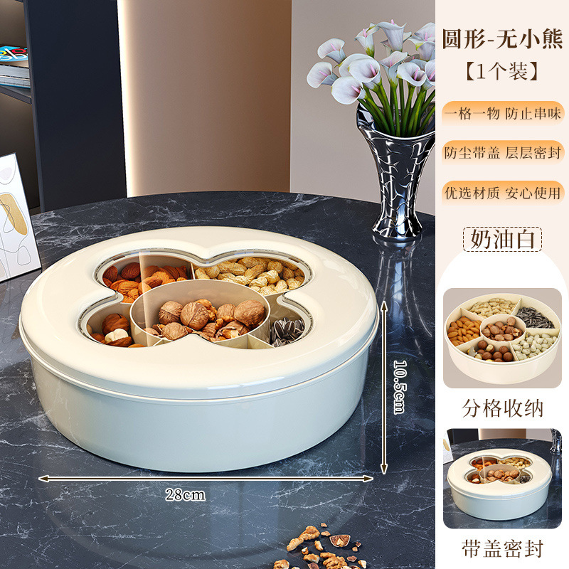 • 라이트 럭셔리 크림 화이트 [둥근 스타일] 밀봉된 말린 과일 접시 - 손잡이 없음 [칸막이 수납/방진 커버 포함] 1팩