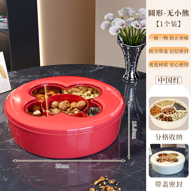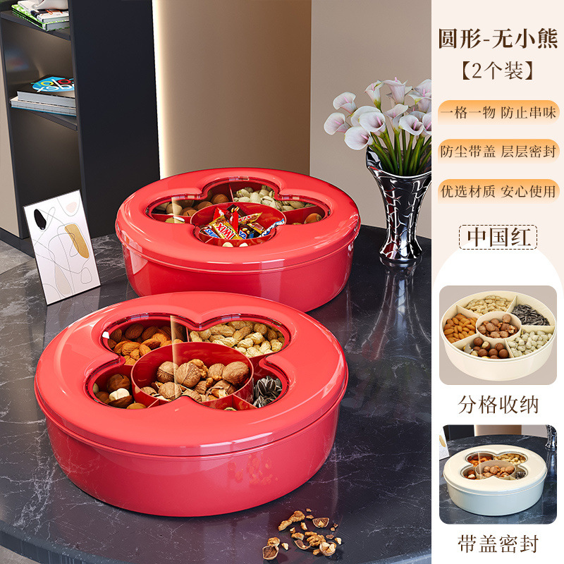 • 클래식 차이니즈 레드 [둥근 스타일] 밀봉된 말린 과일 접시 - 손잡이 없음 [칸막이 수납/방진 커버 포함] 1팩