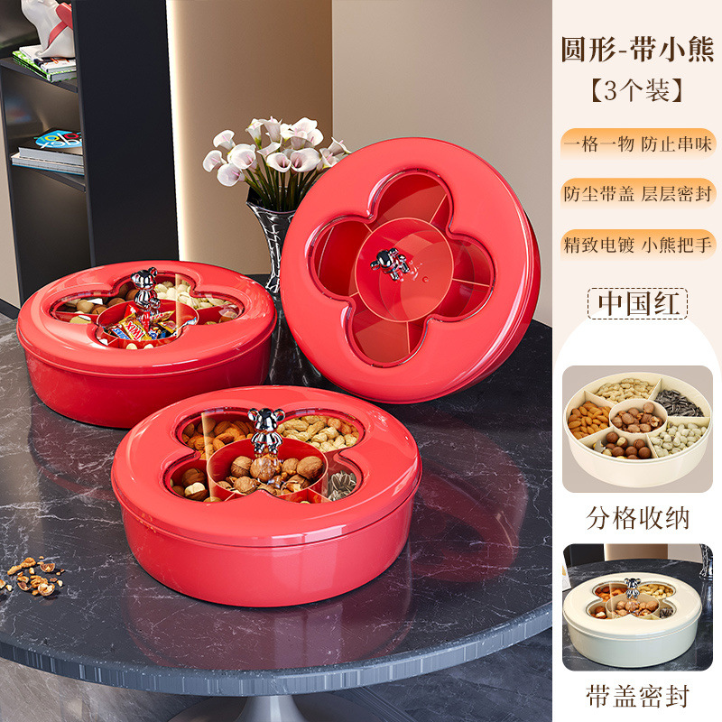 • 클래식 차이니즈 레드 [둥근 스타일] 밀봉된 말린 과일 접시 - 손잡이 스타일 [칸막이 수납/방진 커버 포함] 3개 팩
