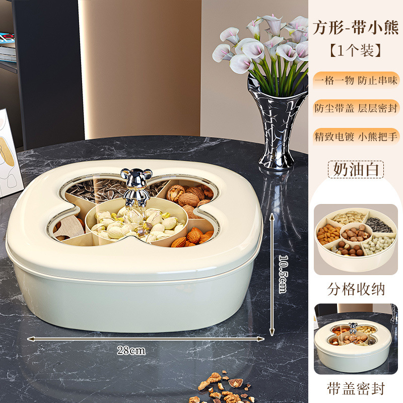• 라이트 럭셔리 크림 화이트 [사각형 스타일] 밀봉 건조 과일 접시 - 손잡이 스타일 [칸막이 수납/방진 커버 포함] 1팩