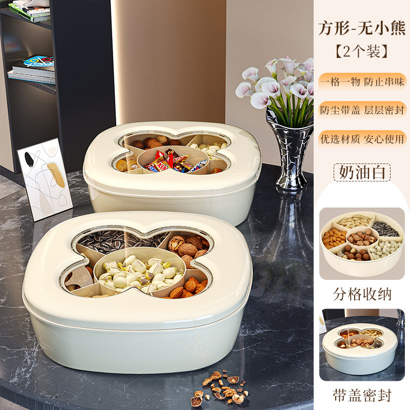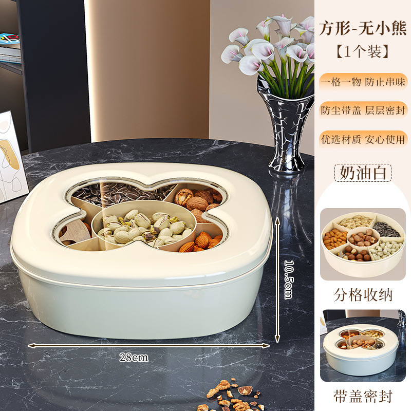 • 라이트 럭셔리 크림 화이트 [사각형 스타일] 밀봉 건조 과일 접시 - 손잡이 없음 [칸막이 수납/방진 커버 포함] 1팩