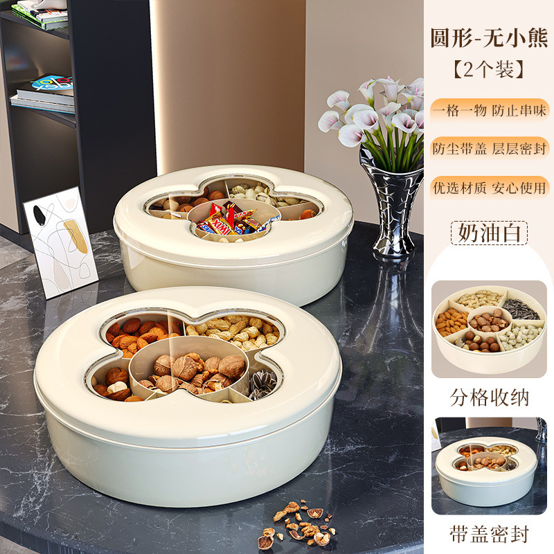 • 라이트 럭셔리 크림 화이트 [둥근 스타일] 밀봉된 말린 과일 접시 - 손잡이 없음 [칸막이 수납/방진 커버 포함] 2개 팩