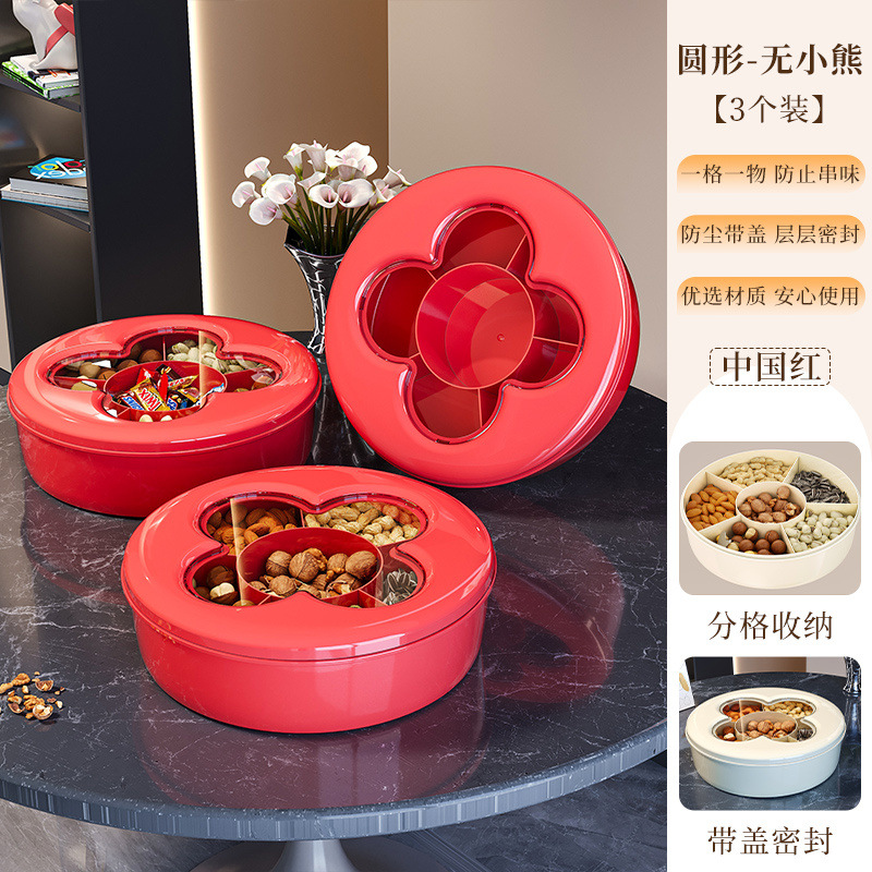 • 클래식 차이니즈 레드 [둥근 스타일] 밀봉된 말린 과일 접시 - 손잡이 없음 [칸막이 수납/방진 커버 포함] 3개 팩