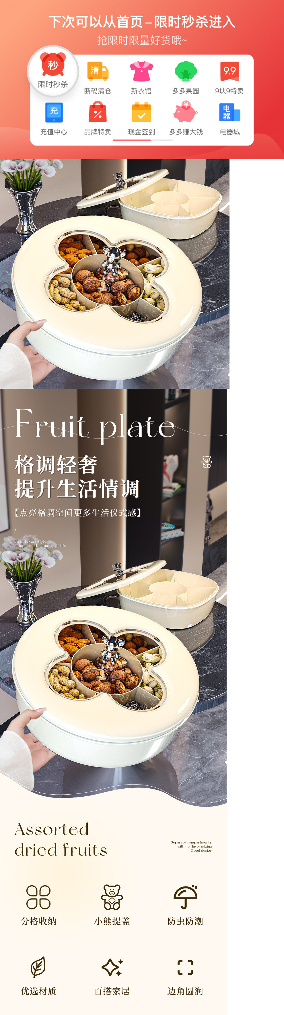 • 라이트 럭셔리 크림 화이트 [둥근 스타일] 밀봉된 말린 과일 접시 - 손잡이 스타일 [칸막이 수납/방진 커버 포함] 1팩