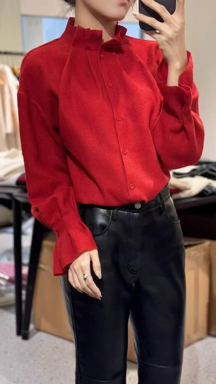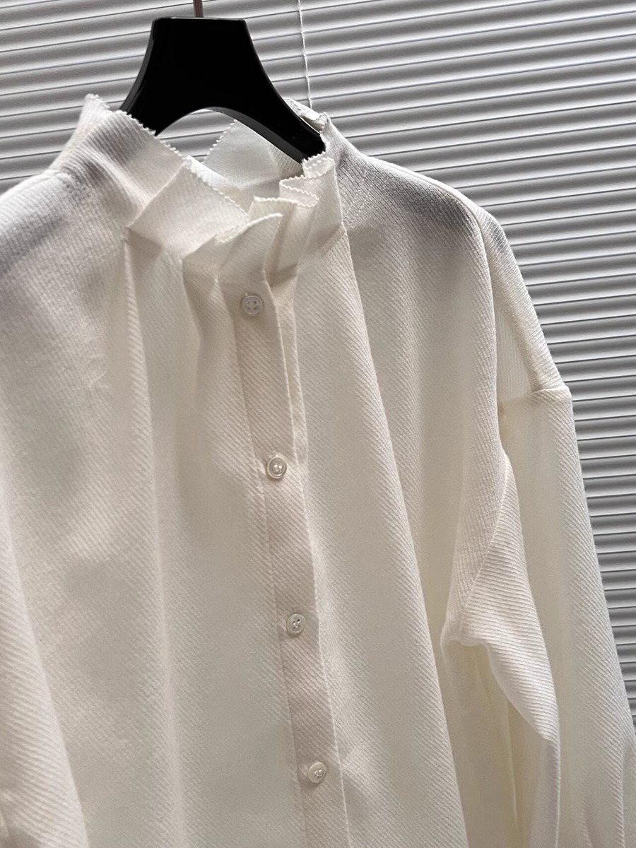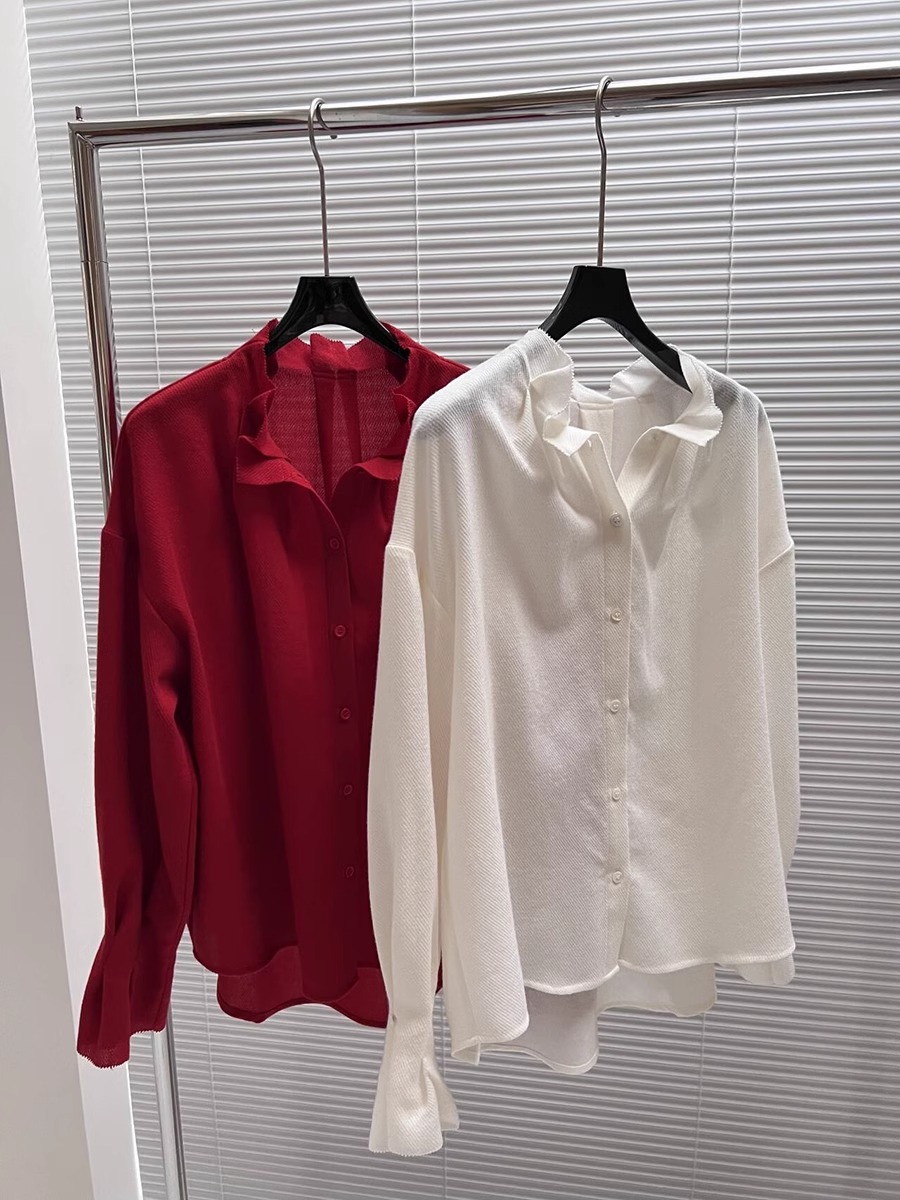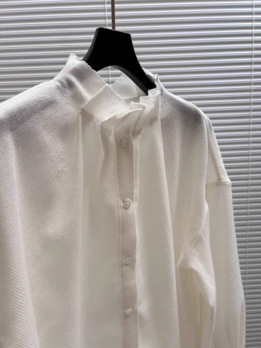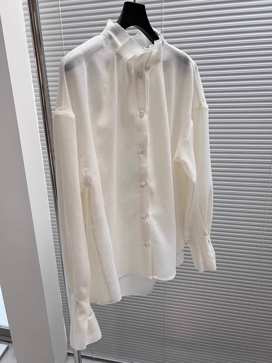재고 25 년 동안 프랑스 부드러운 피부 친화적 인 양모 회전 3 차원 주름 꽃잎 칼라 진주 버클 셔츠