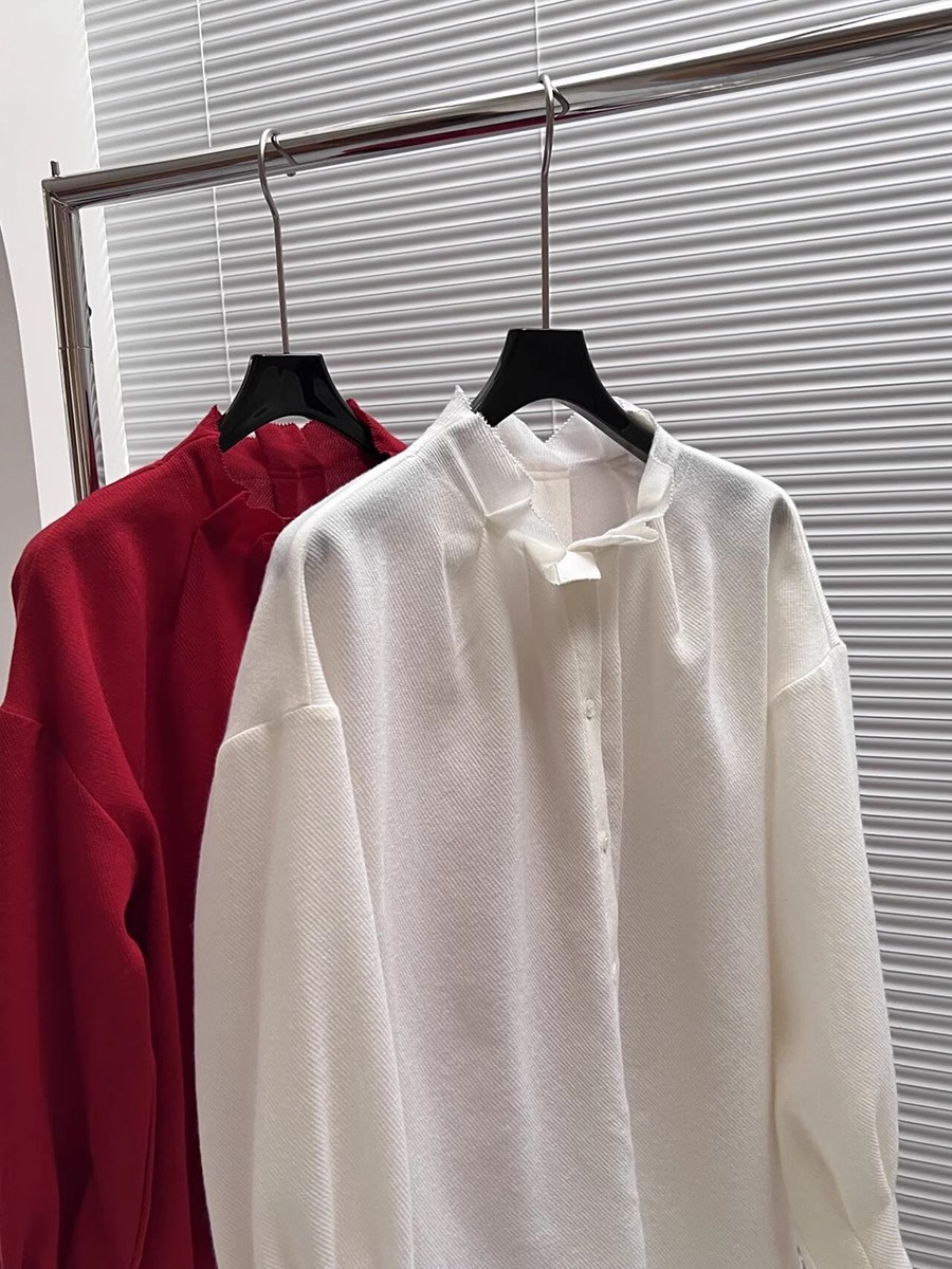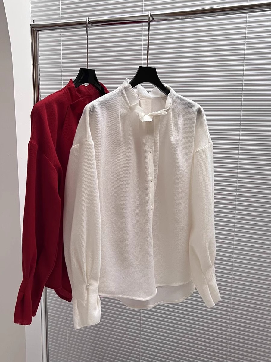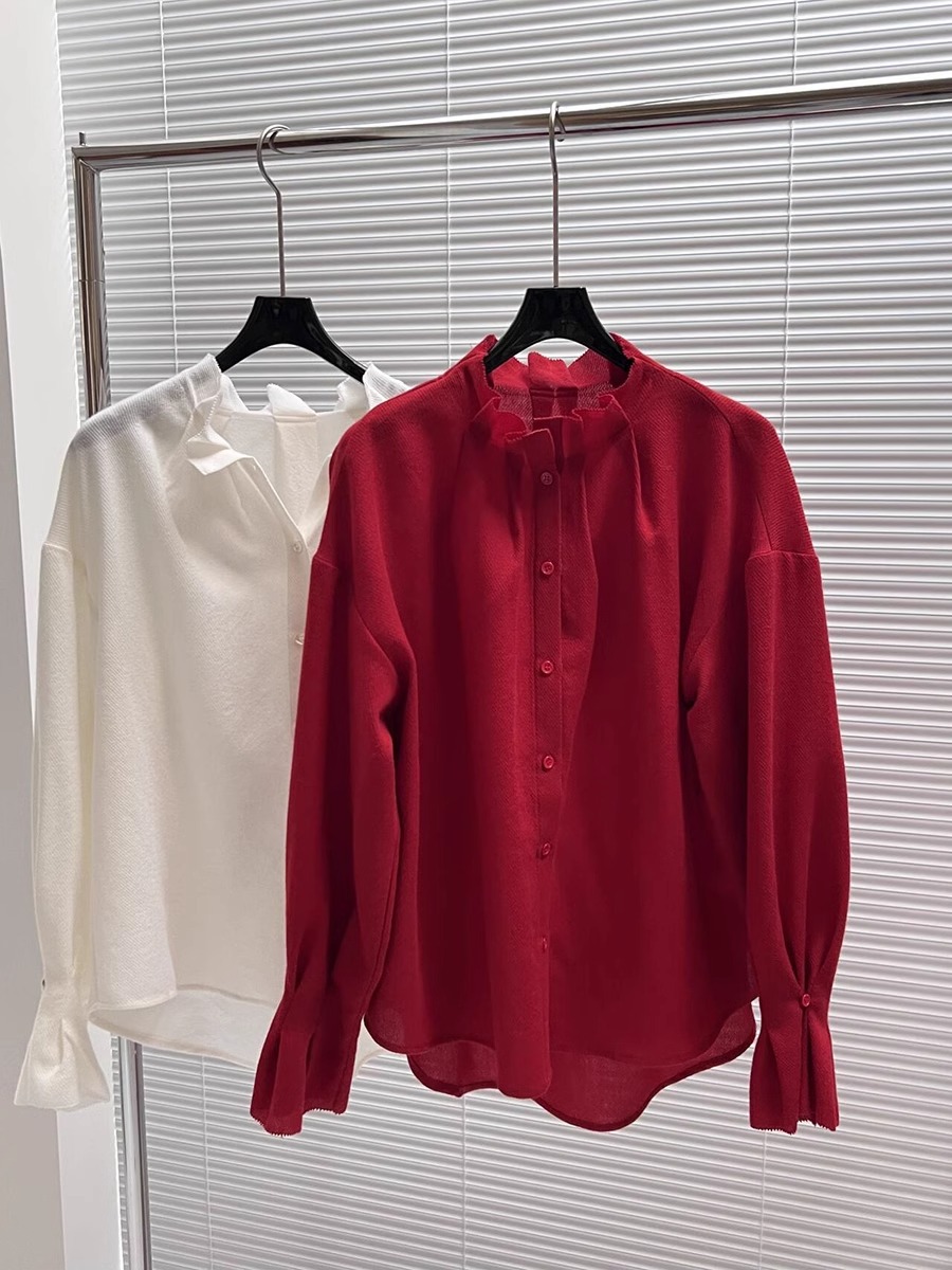 재고 25 년 동안 프랑스 부드러운 피부 친화적 인 양모 회전 3 차원 주름 꽃잎 칼라 진주 버클 셔츠스토어 가기