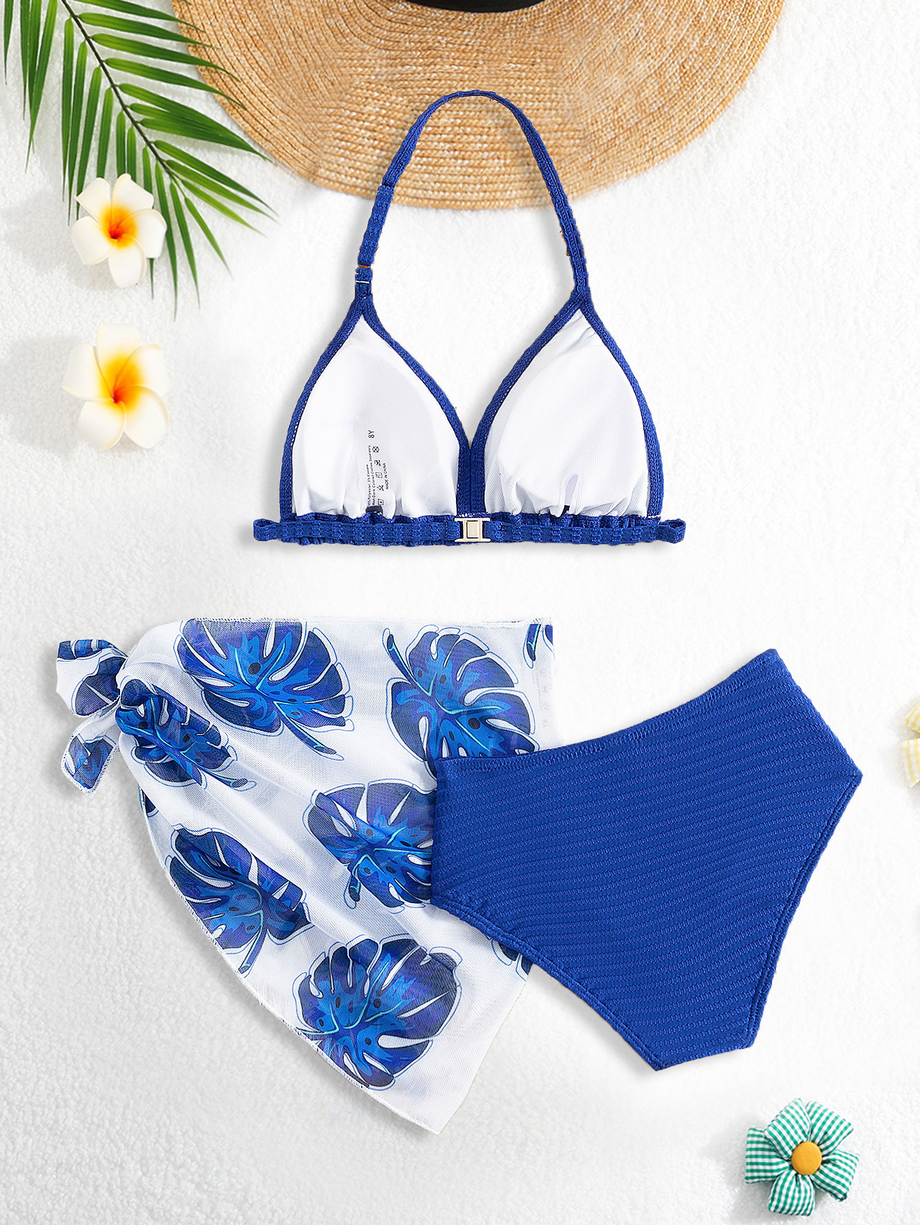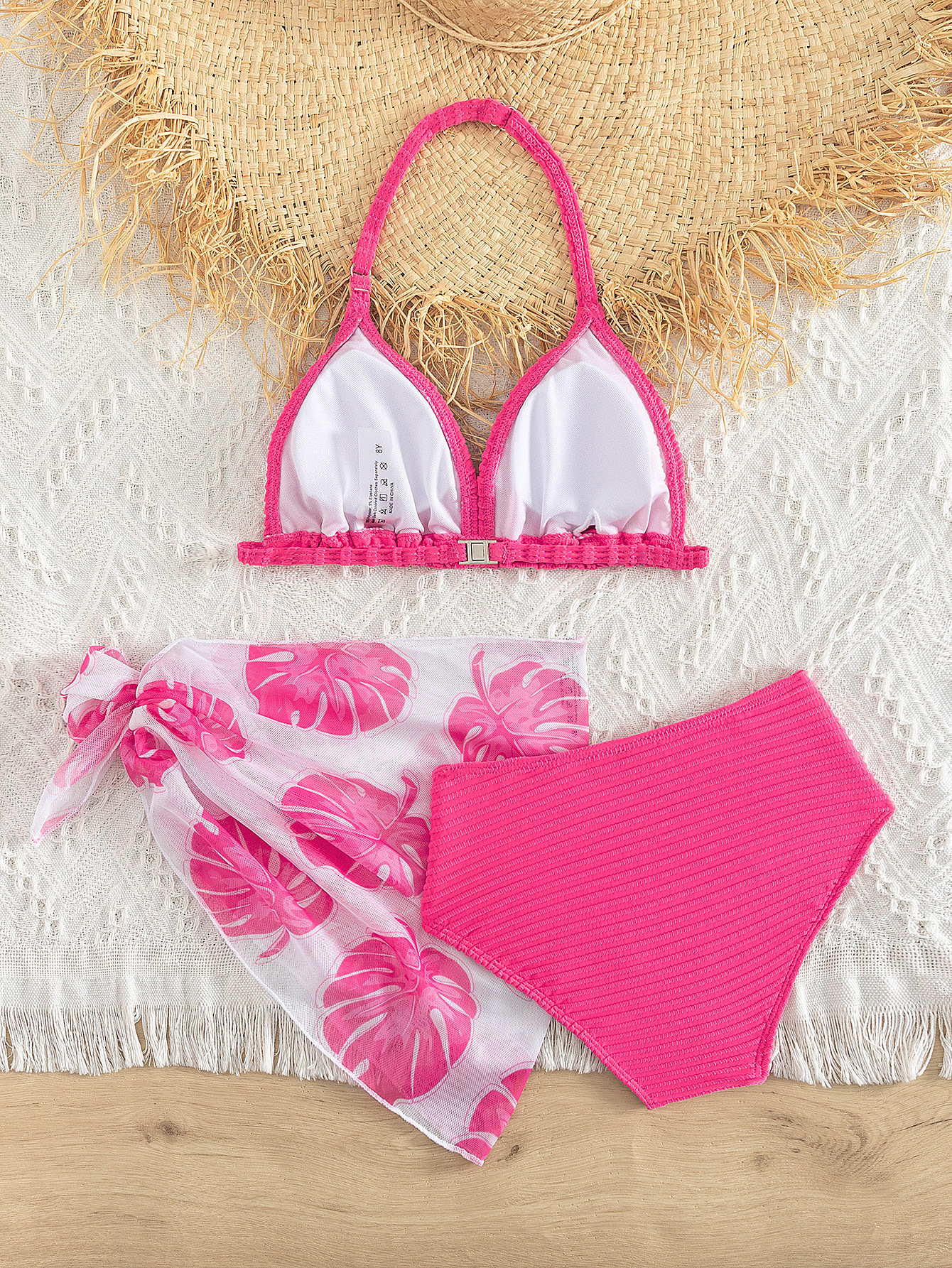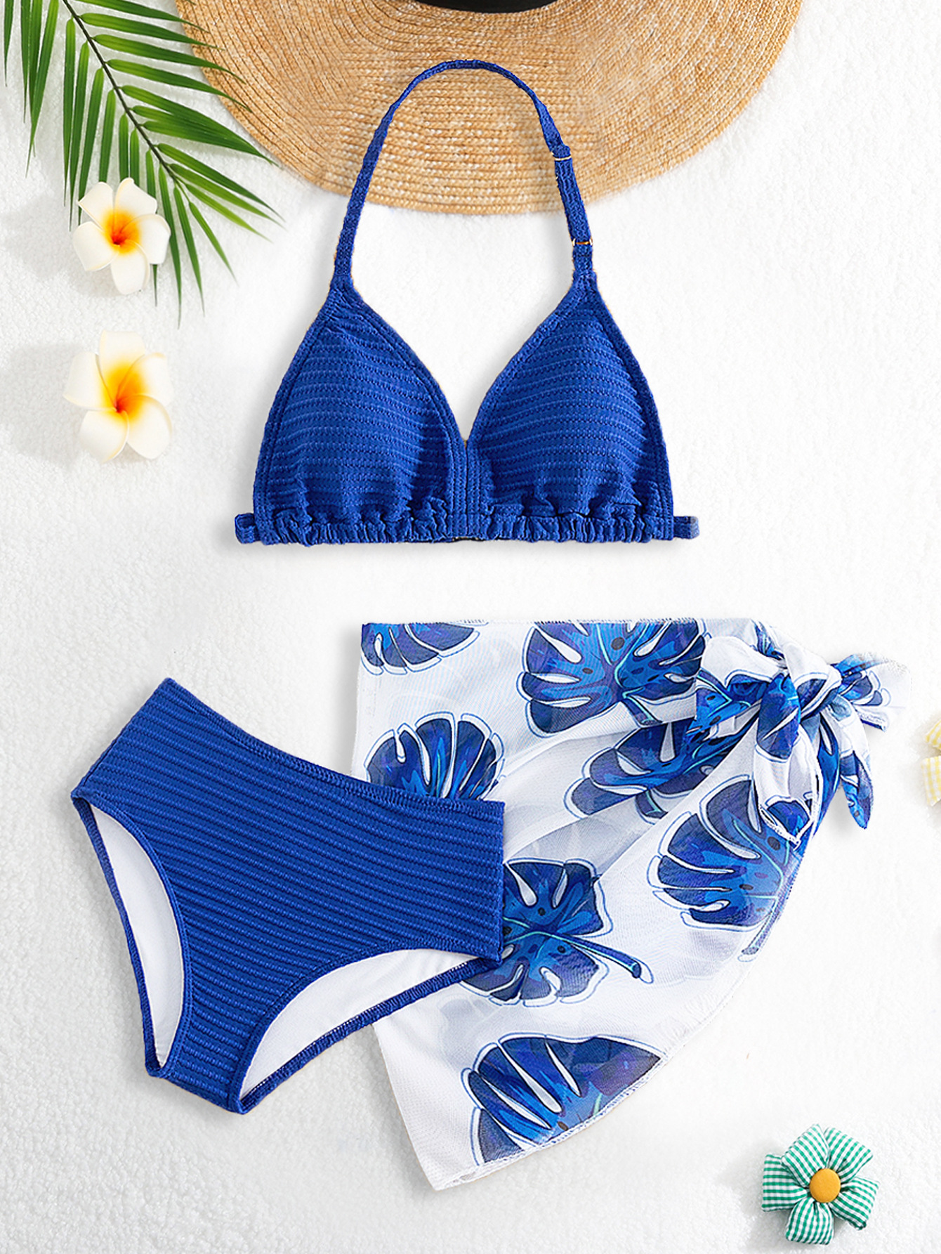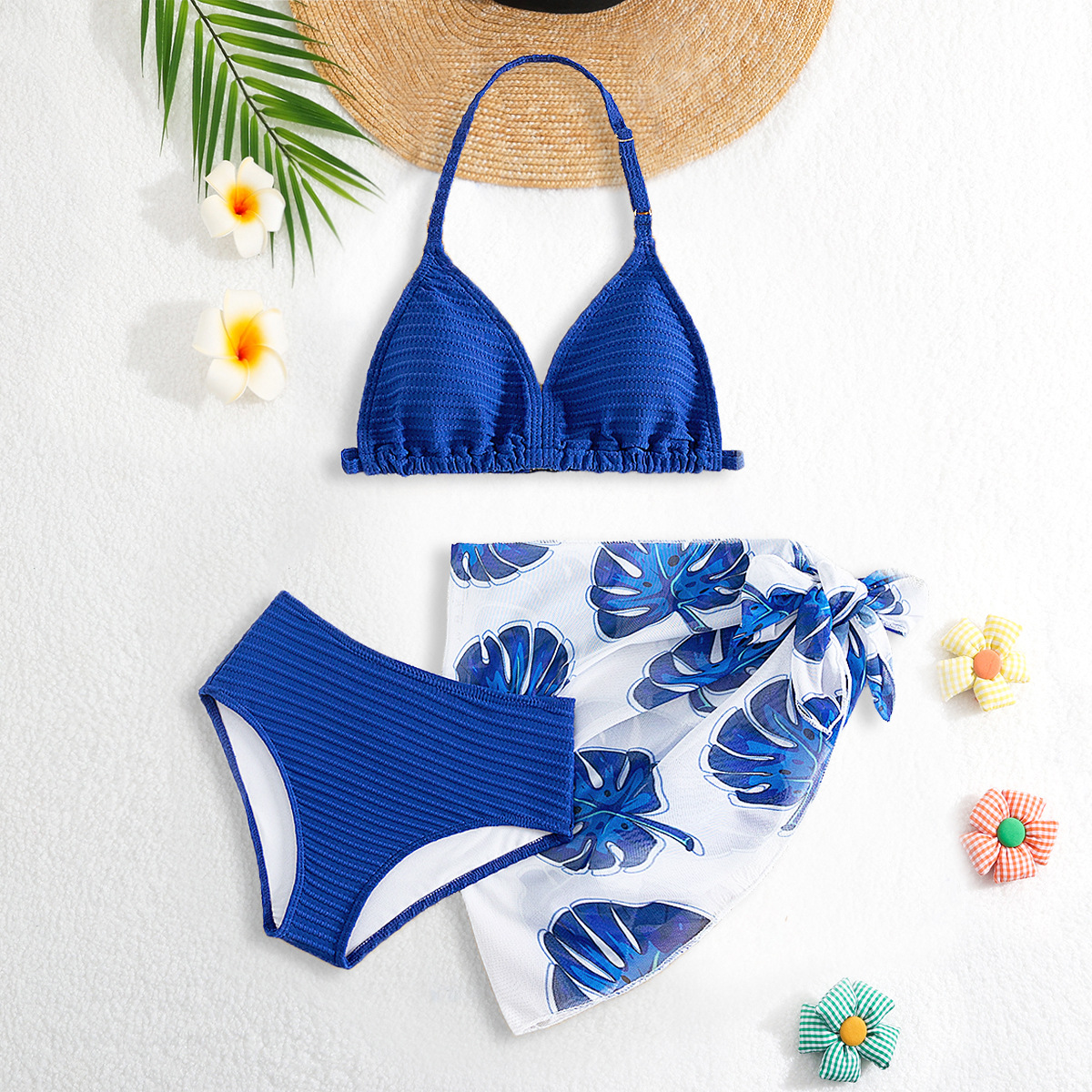 25 년 된 질감 패브릭 바나나 리프 프린트 거즈 스커트 3 피스 비키니 소녀 수영복 유럽과 미국 아마존