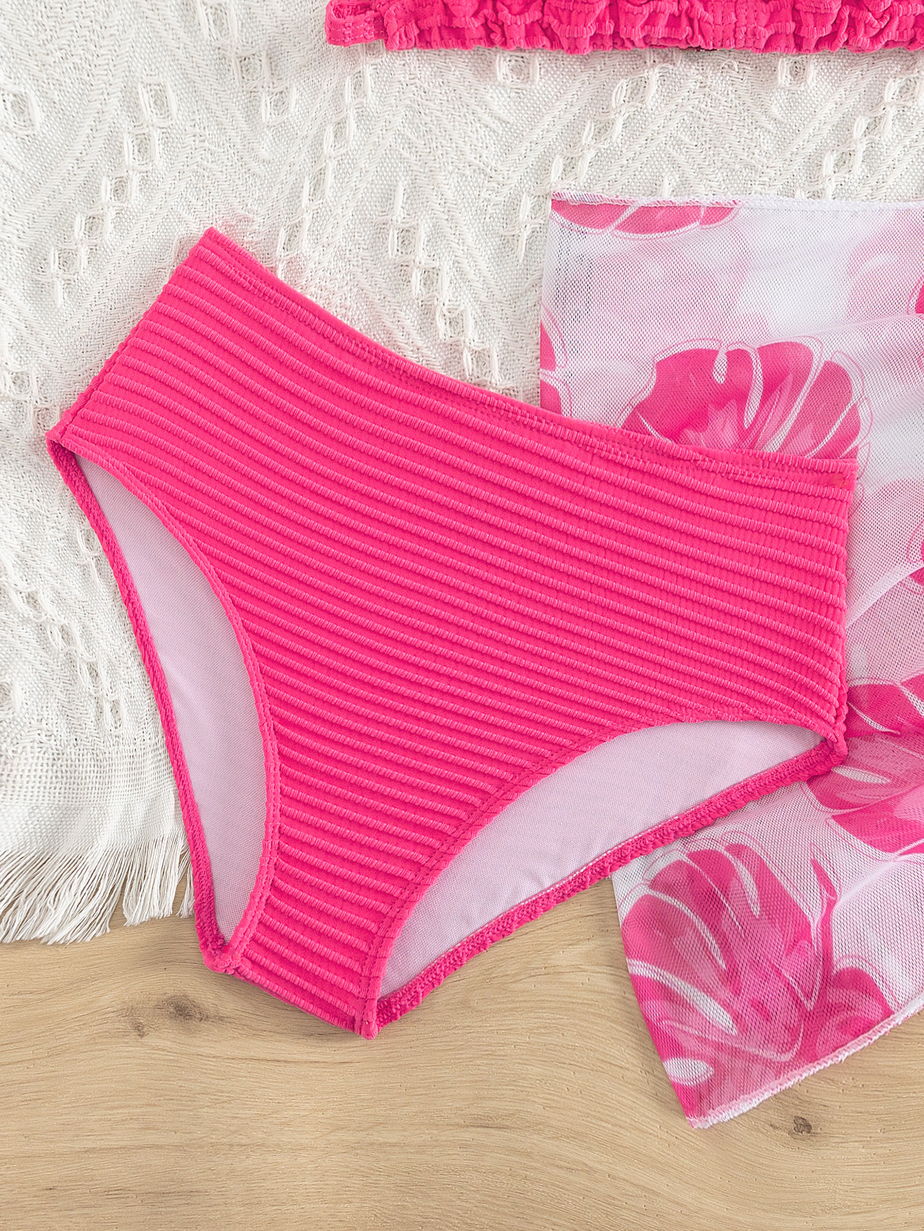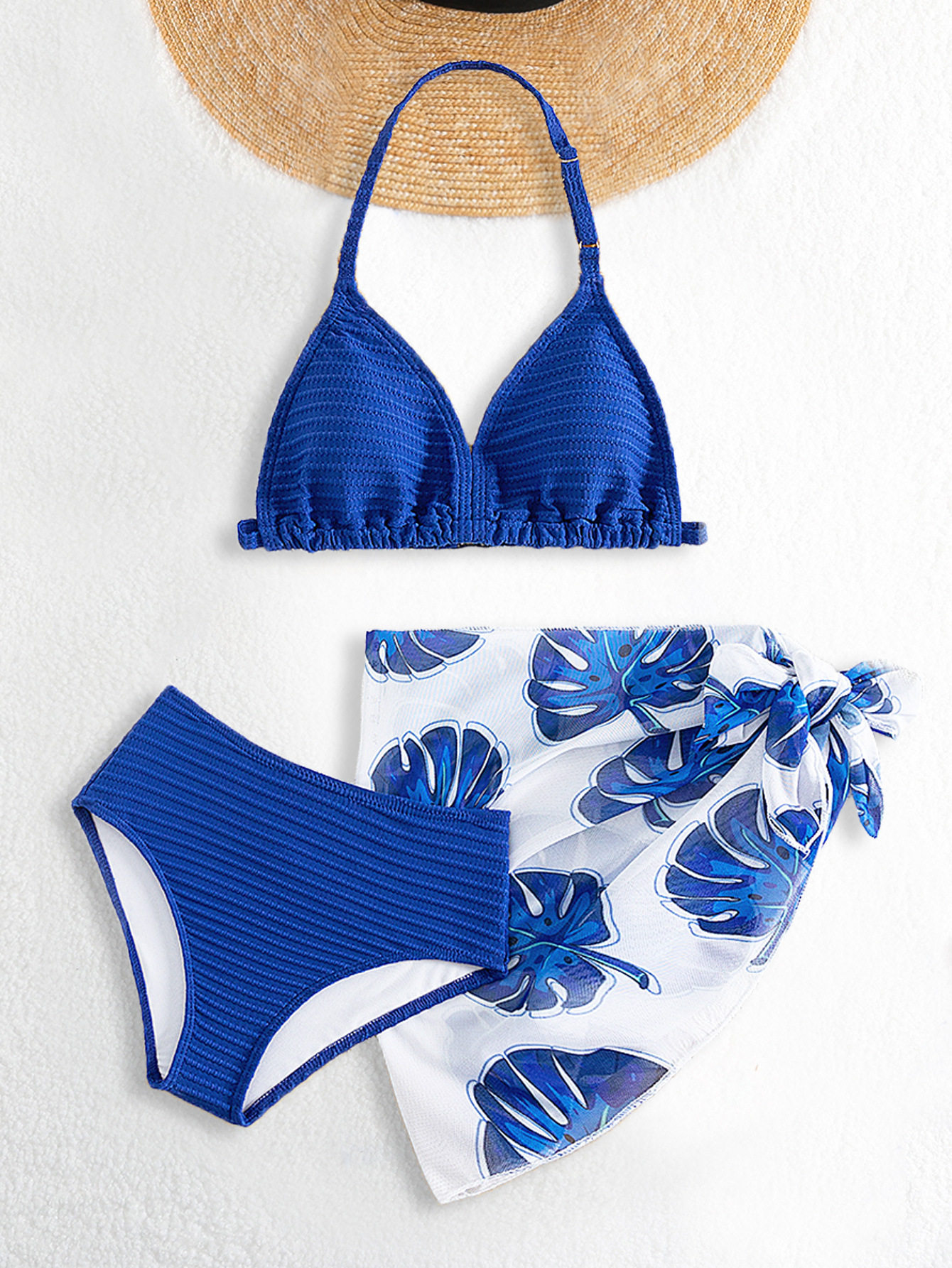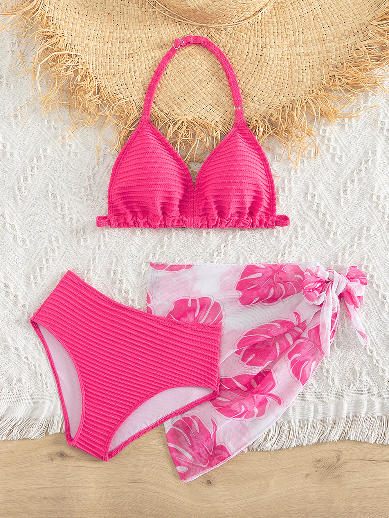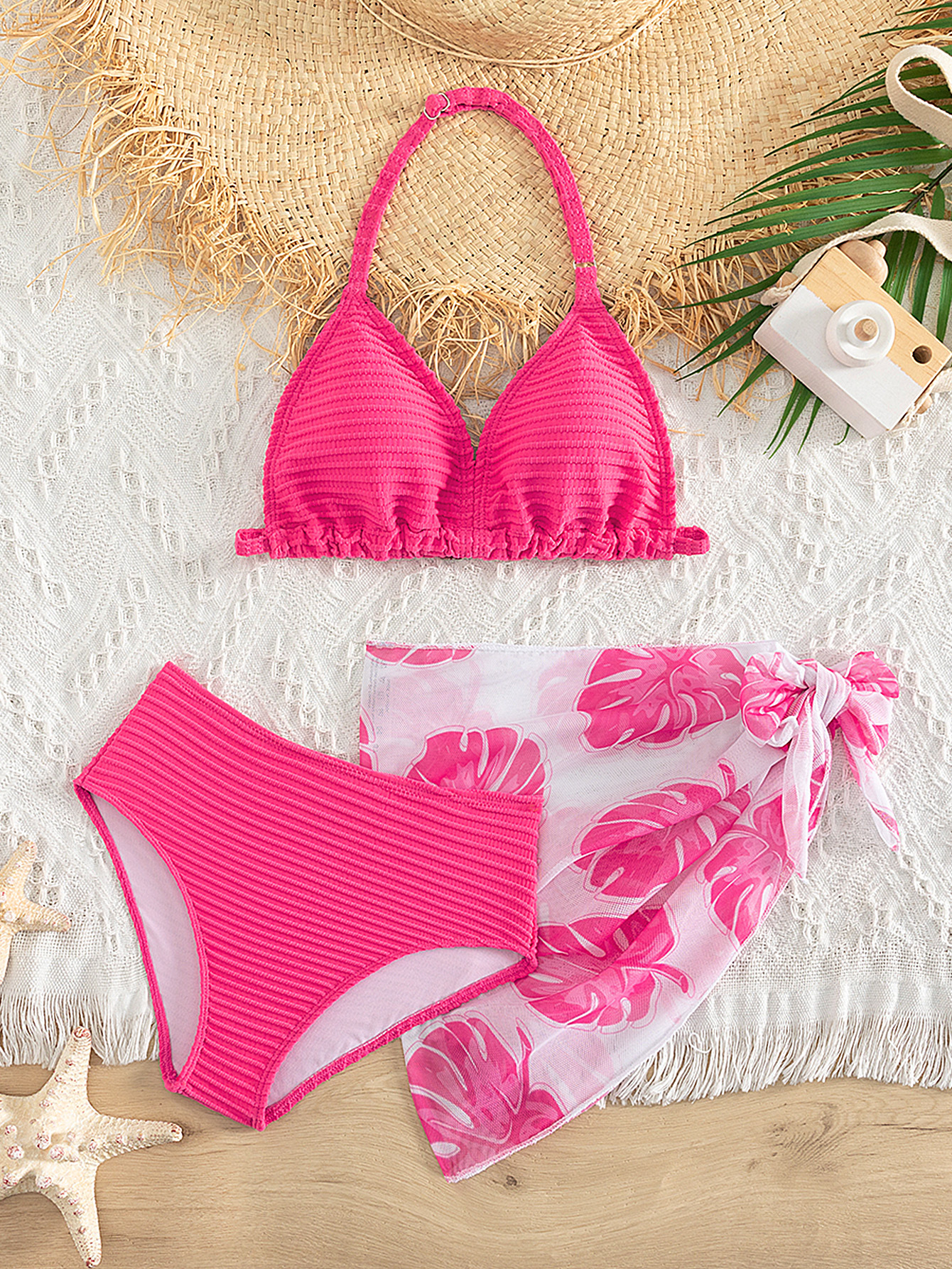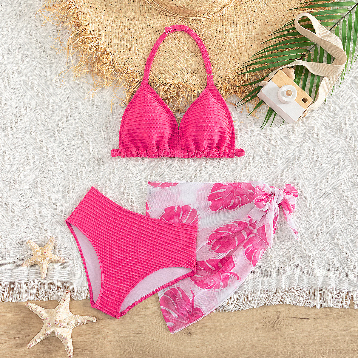 25 년 된 질감 패브릭 바나나 리프 프린트 거즈 스커트 3 피스 비키니 소녀 수영복 유럽과 미국 아마존
