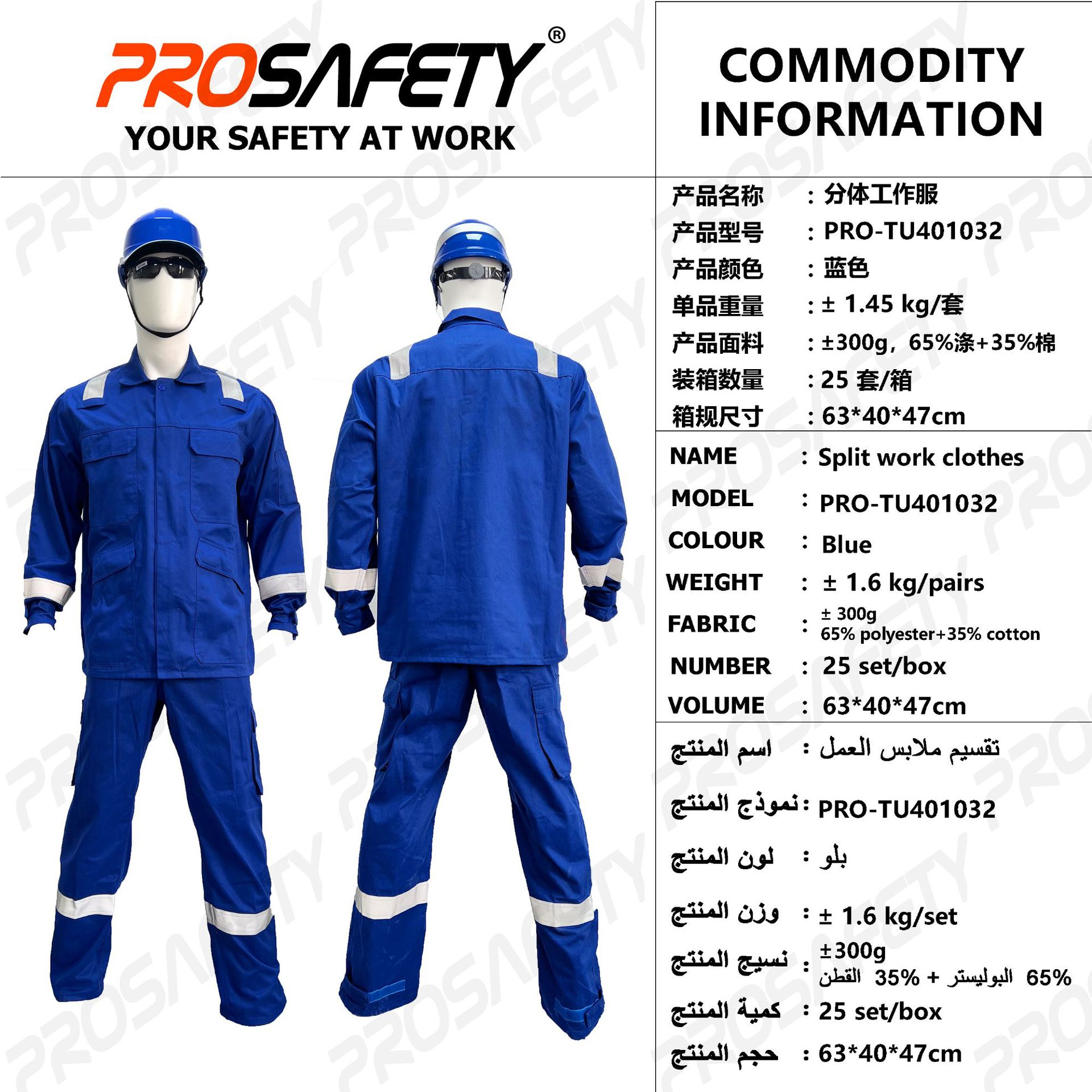 PROSAFETY 수출 분할 작업복 세트 폴리 에스테르 면화 두꺼운 통기성 보호 방지 의류 자수 로고