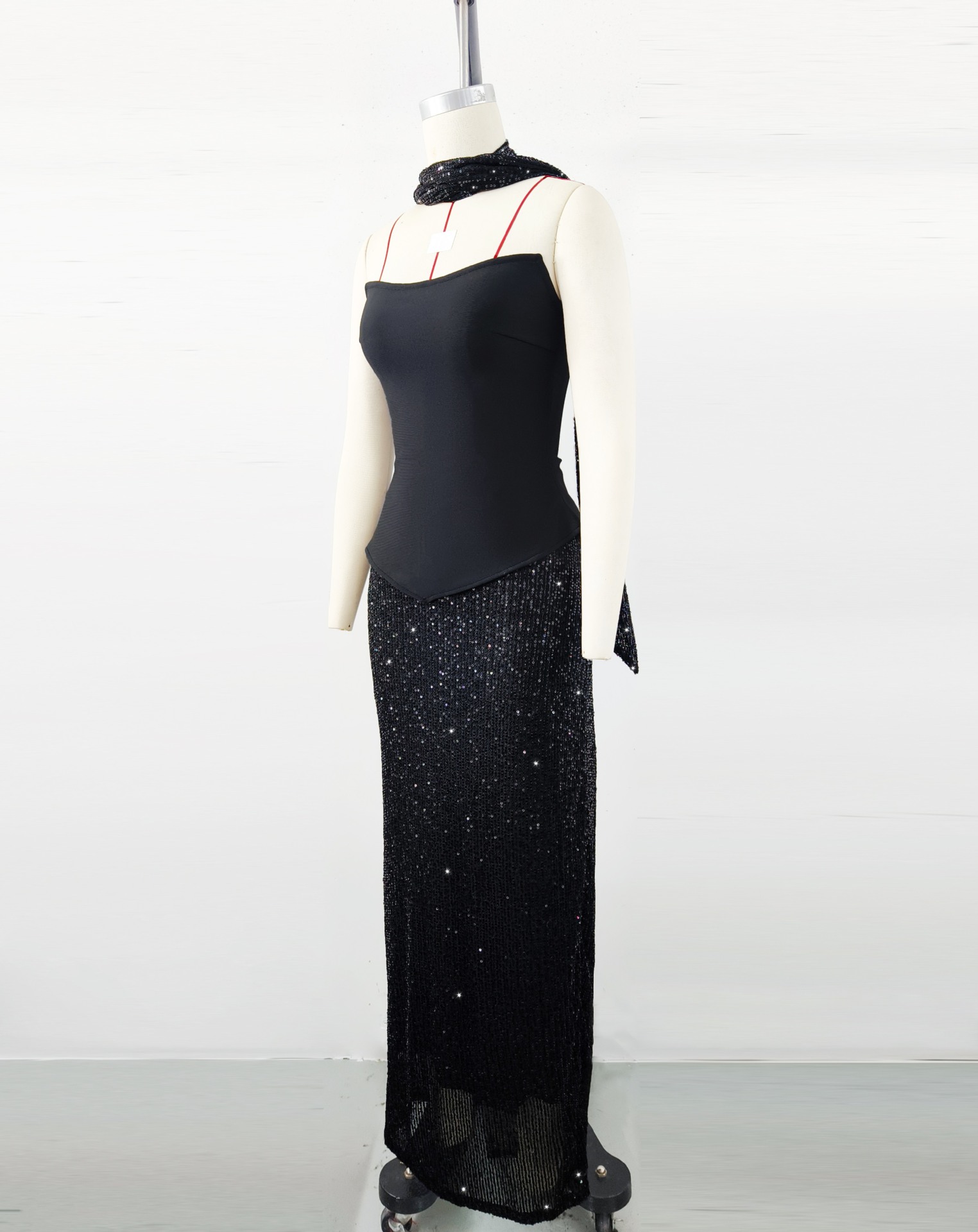 유럽과 미국의 독립 역 대외 무역 여성의 우아한 스카프 붕대 스커트 반 길이 스팽글 스커트 세트 사교계 연회 원피스