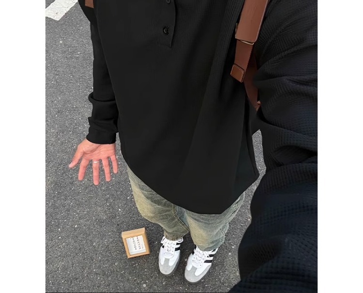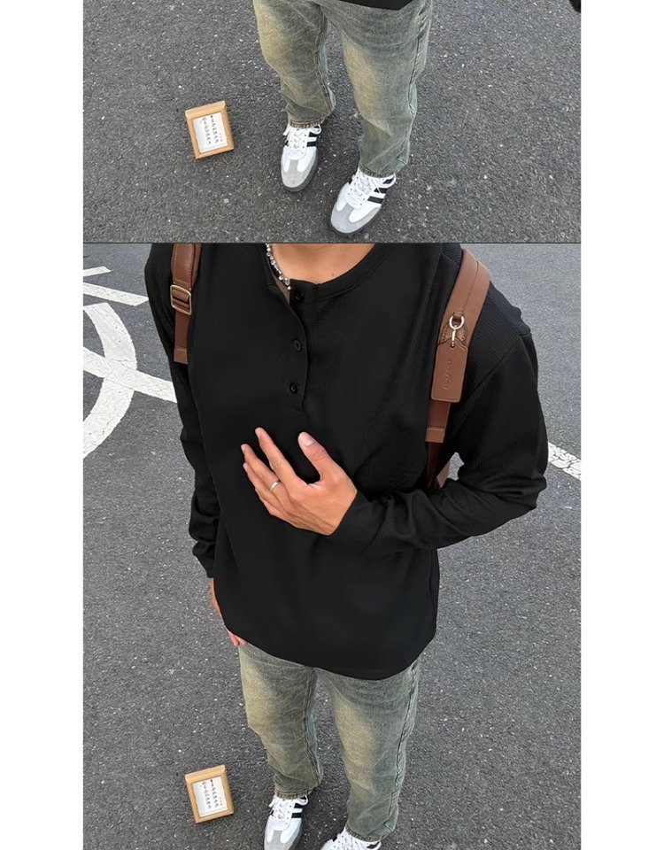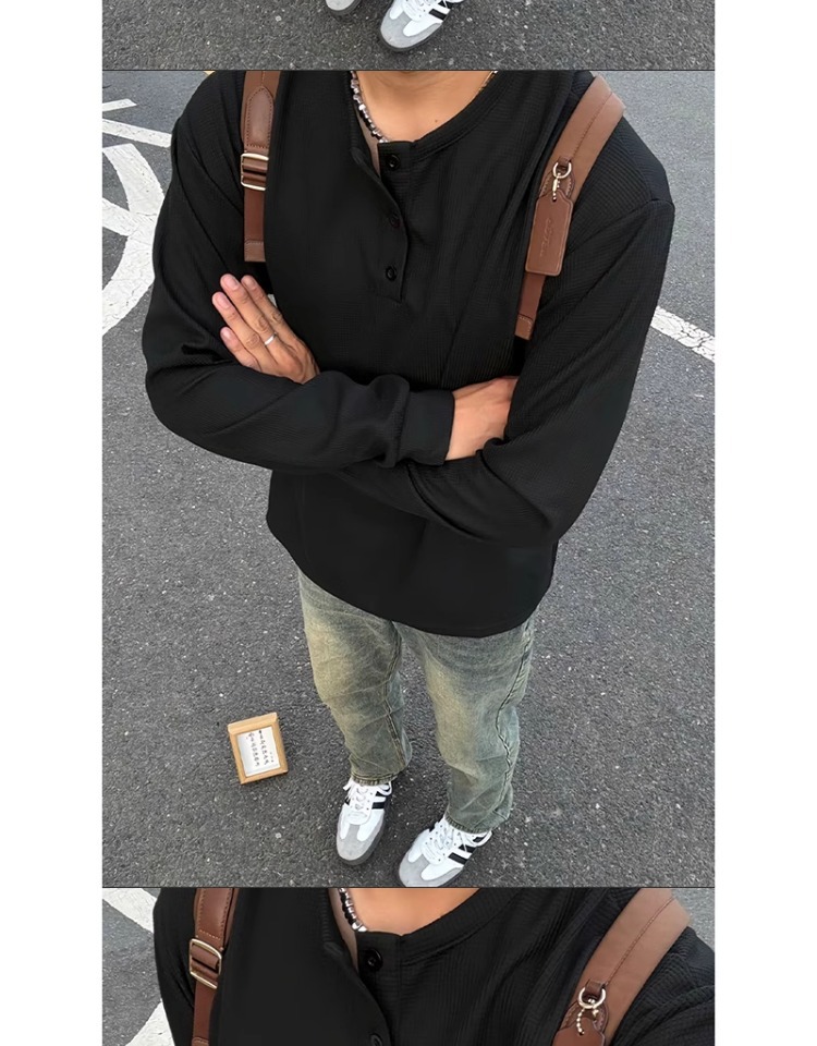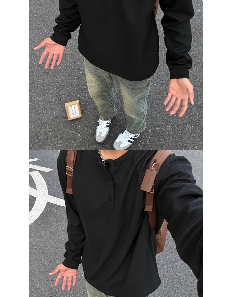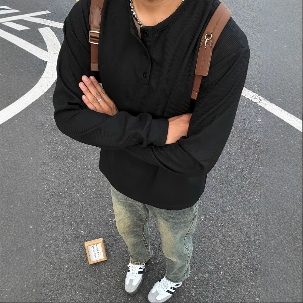 일본 헨리 칼라 긴팔 티셔츠 남성용 봄과 가을 와플 스웨트 셔츠 특대 미국식 하이 스트리트 블랙 탑스토어 가기
