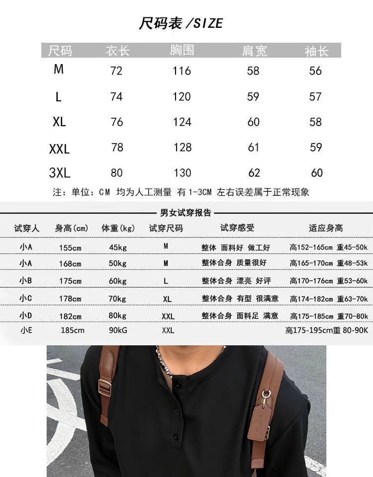 일본 헨리 칼라 긴팔 티셔츠 남성용 봄과 가을 와플 스웨트 셔츠 특대 미국식 하이 스트리트 블랙 탑