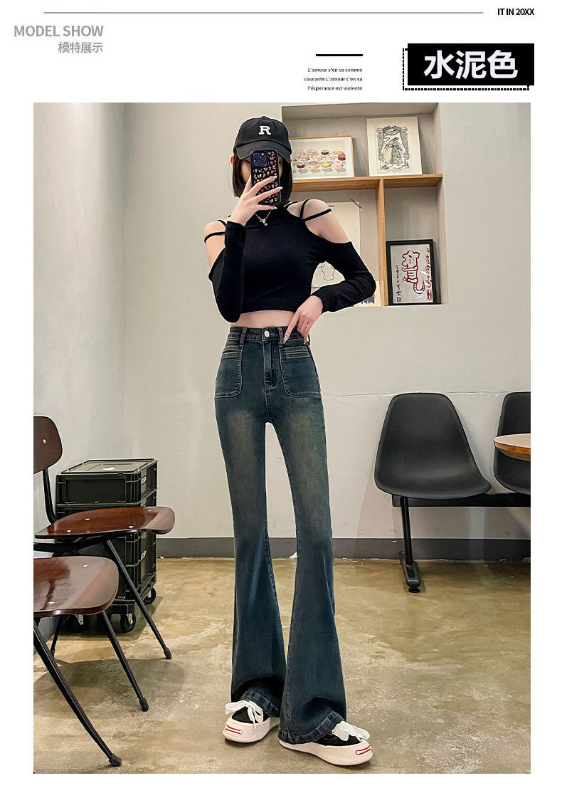 시멘트 그레이 플래 팬츠 봄과 가을 새로운 빈티지 플러스 사이즈 통통녀 여성을위한 높은 허리 슬리밍 바닥 청소 마이크로 블래 진 청바지스토어 가기